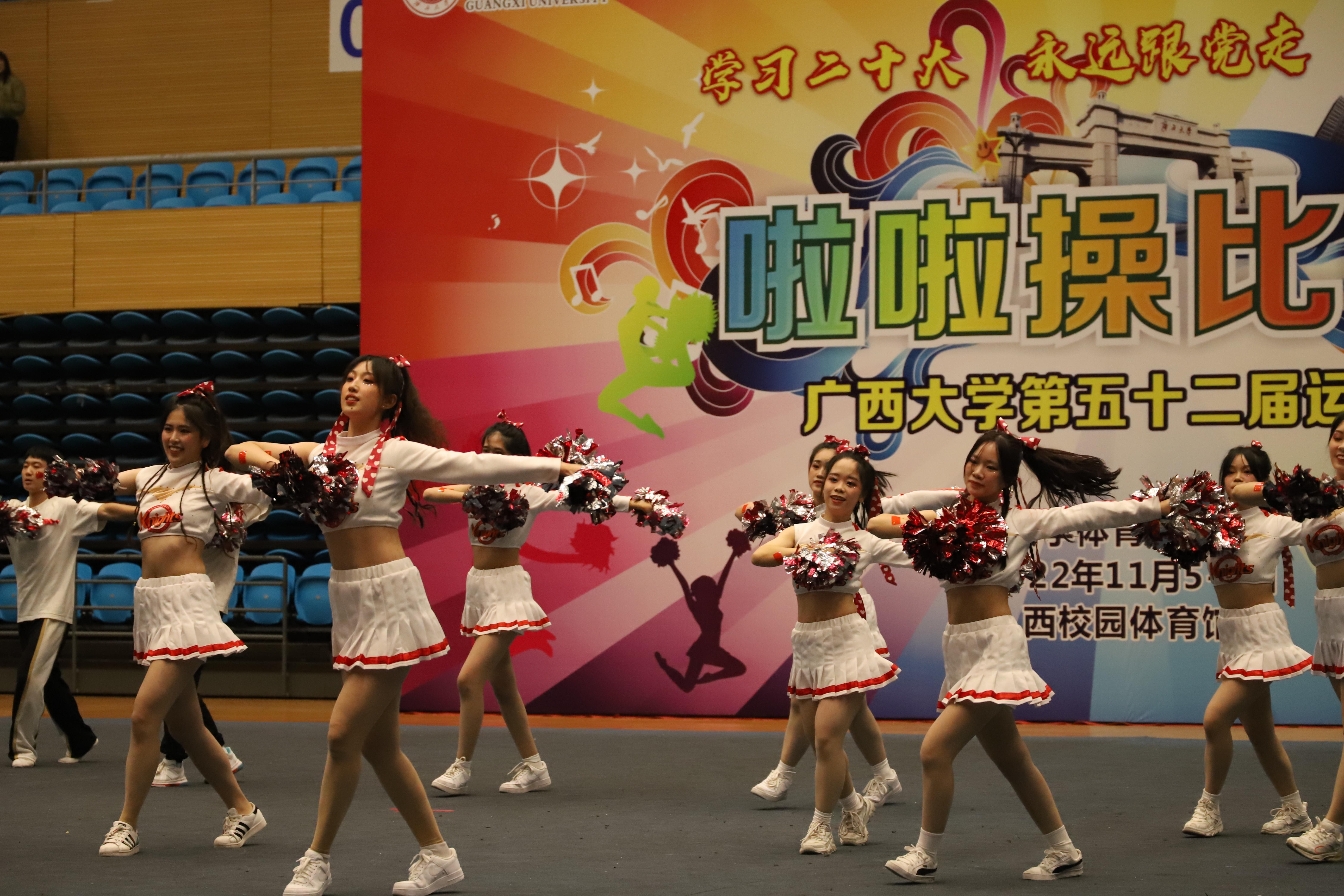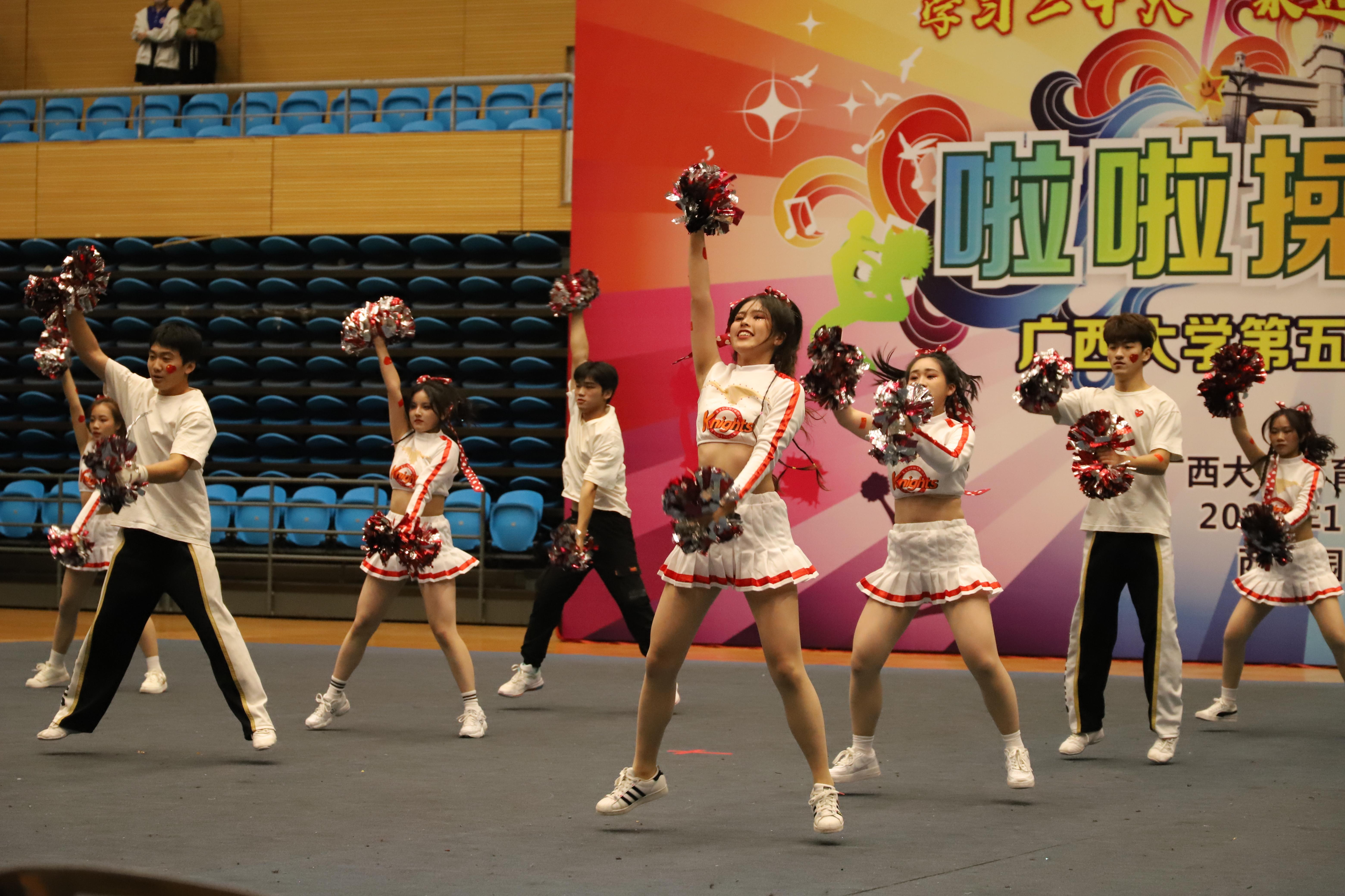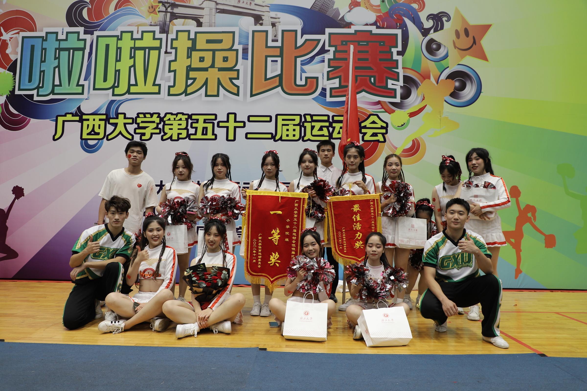 11月6日下午,广西大学第五十二届运动会啦啦操比赛于西综合体育馆拉开比赛序幕,分为大学院组和小学院组,AV直播 代表队带着一支《Lucky Strike》闪亮登场,最终以512分的成绩征服全场,荣获小学院组“一等奖”和“最佳活力奖”。