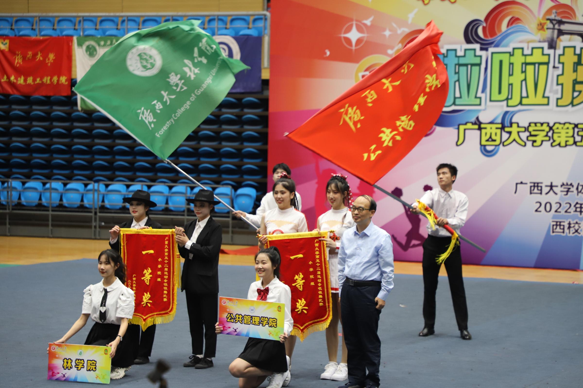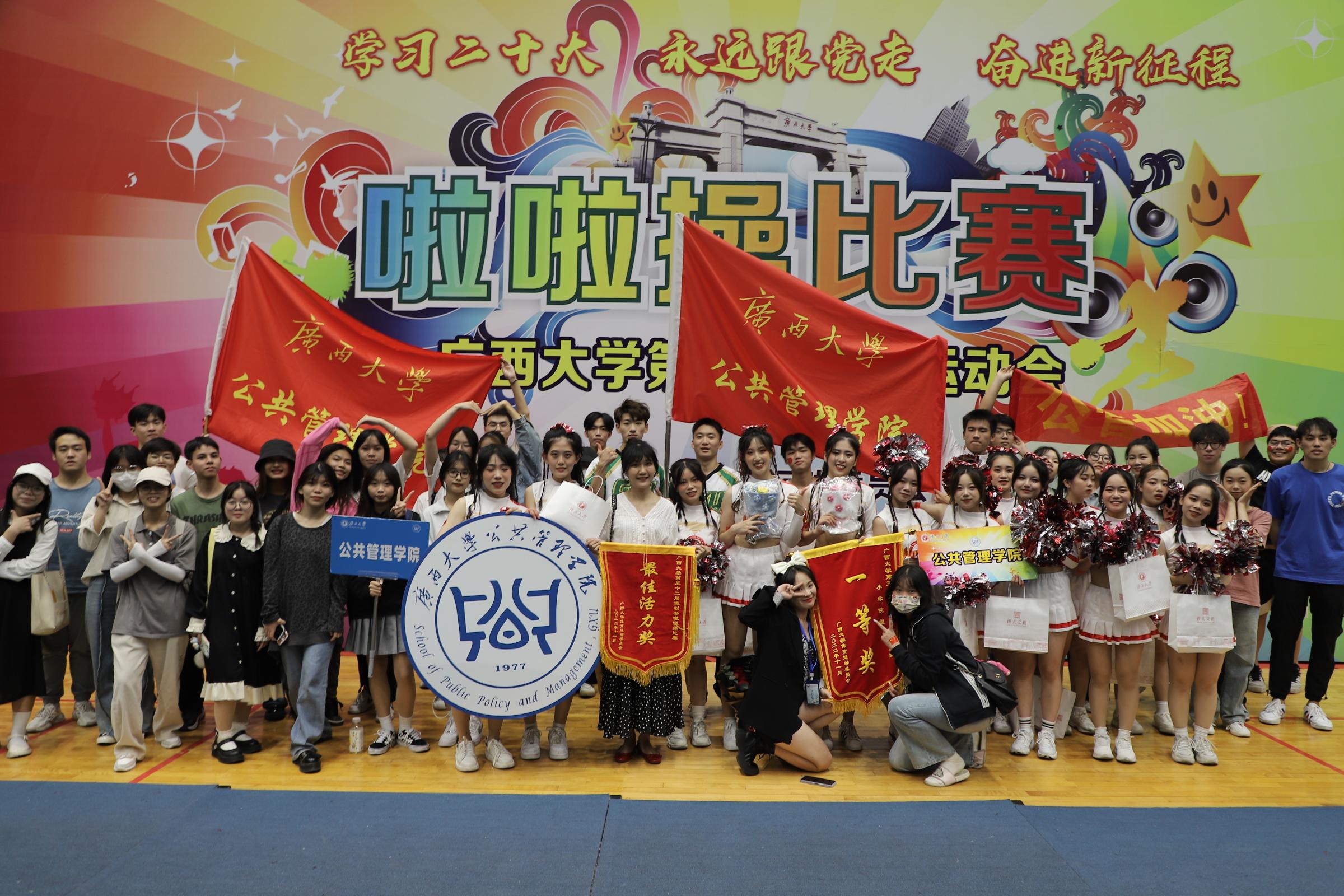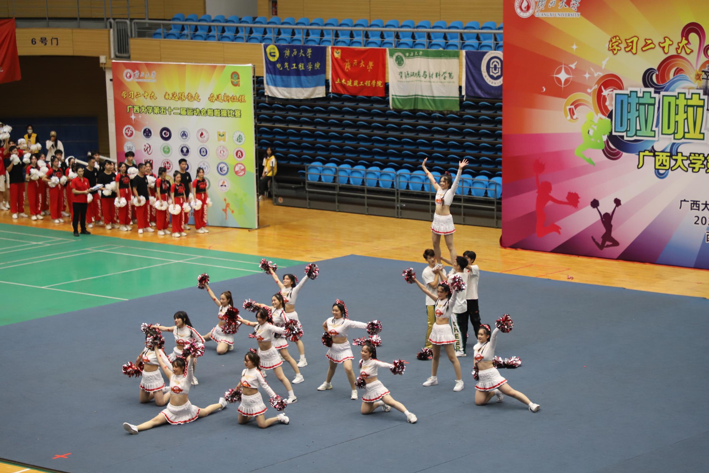 11月6日下午,广西大学第五十二届运动会啦啦操比赛于西综合体育馆拉开比赛序幕,分为大学院组和小学院组,AV直播 代表队带着一支《Lucky Strike》闪亮登场,最终以512分的成绩征服全场,荣获小学院组“一等奖”和“最佳活力奖”。