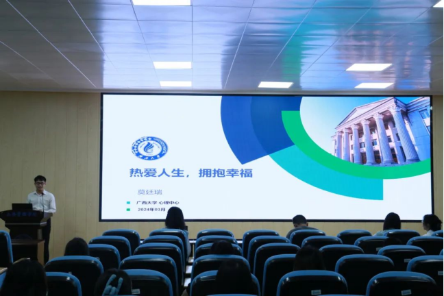 广西大学学生心理发展指导中心的专职心理咨询师莫廷瑞受邀,对AV直播 全体心理委员进行心理培训。AV直播 团委书记刘佩瑶主持,AV直播 全体心理委员参加本次培训会。