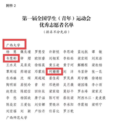 由教育部、体育总局、共青团中央主办,广西壮族自治区人民政府承办的第一届全国学生(青年)运动会,于2023年11月5日至15日在广西南宁举行。AV直播 学生积极参与,用行动践行志愿精神,用爱与奉献诠释服务与担当。来自AV直播 的何姗姗、韦慧彬在第一届全国学生(青年)运动会中获“优秀志愿者”荣誉称号