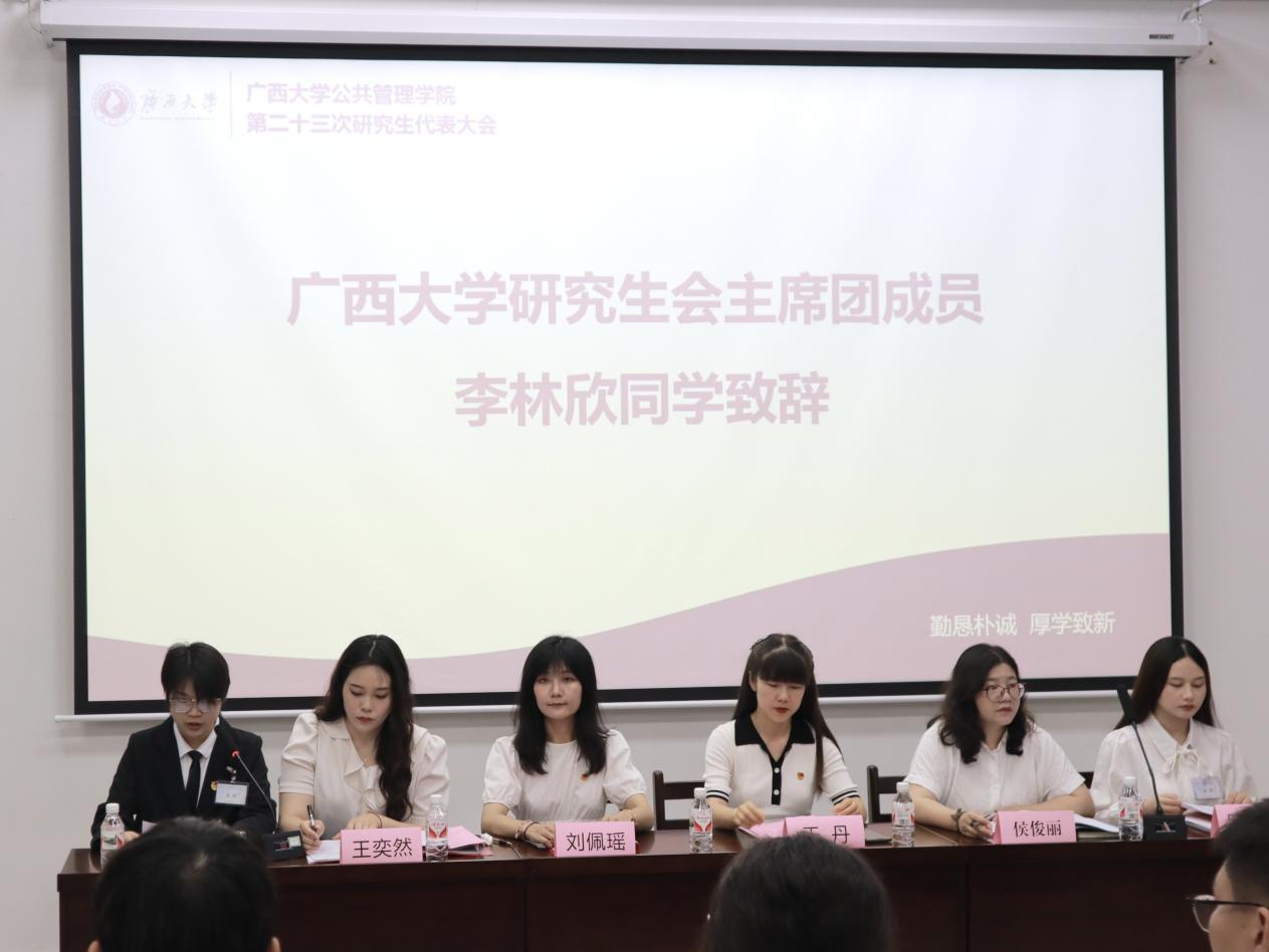 广西大学研究生会主席团成员李林欣同学在致辞中指出,AV直播 研究生会始终支持和配合校研究生会的各项工作,在学术科研、文体活动、志愿服务、权益维护等方面开展了一系列工作,举办了许多具有学院特色的品牌活动,为学院发展和高素质人才培养做出了重要贡献。她表示,希望新一届研究生会全体成员能不忘初心,牢记使命,与校研会携手并进,共同把研究生引领与服务工作推向新的高度,谱写出更加灿烂辉煌的新篇章。