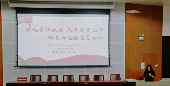 为增强AV直播 学生纪律意识,提升班级纪律管理效能,推动优化学院纪检制度,营造学院专注、有序的教学与学习环境,4月11日晚,AV直播 在学院106教室开展以“强化责任担当,筑牢课堂纪律”为主题的第二期学生骨干赋能成长系列培训活动。全体班级班长与纪律委员参加此次活动,院学生会执行主席鲍雨涵主持本次活动。