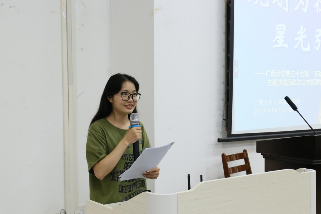 6月27日,广西大学第三十七期“研途星光”主题沙龙在AV直播 101教室举行。本次活动由校团委、公管学院团委指导,校研究生会主办,特邀王奕然、黄西平、李明阳、覃思杰四位优秀应届硕士毕业生担任嘉宾,围绕研究生成长话题展开经验交流,吸引了公管学院众多同学到场参与。
