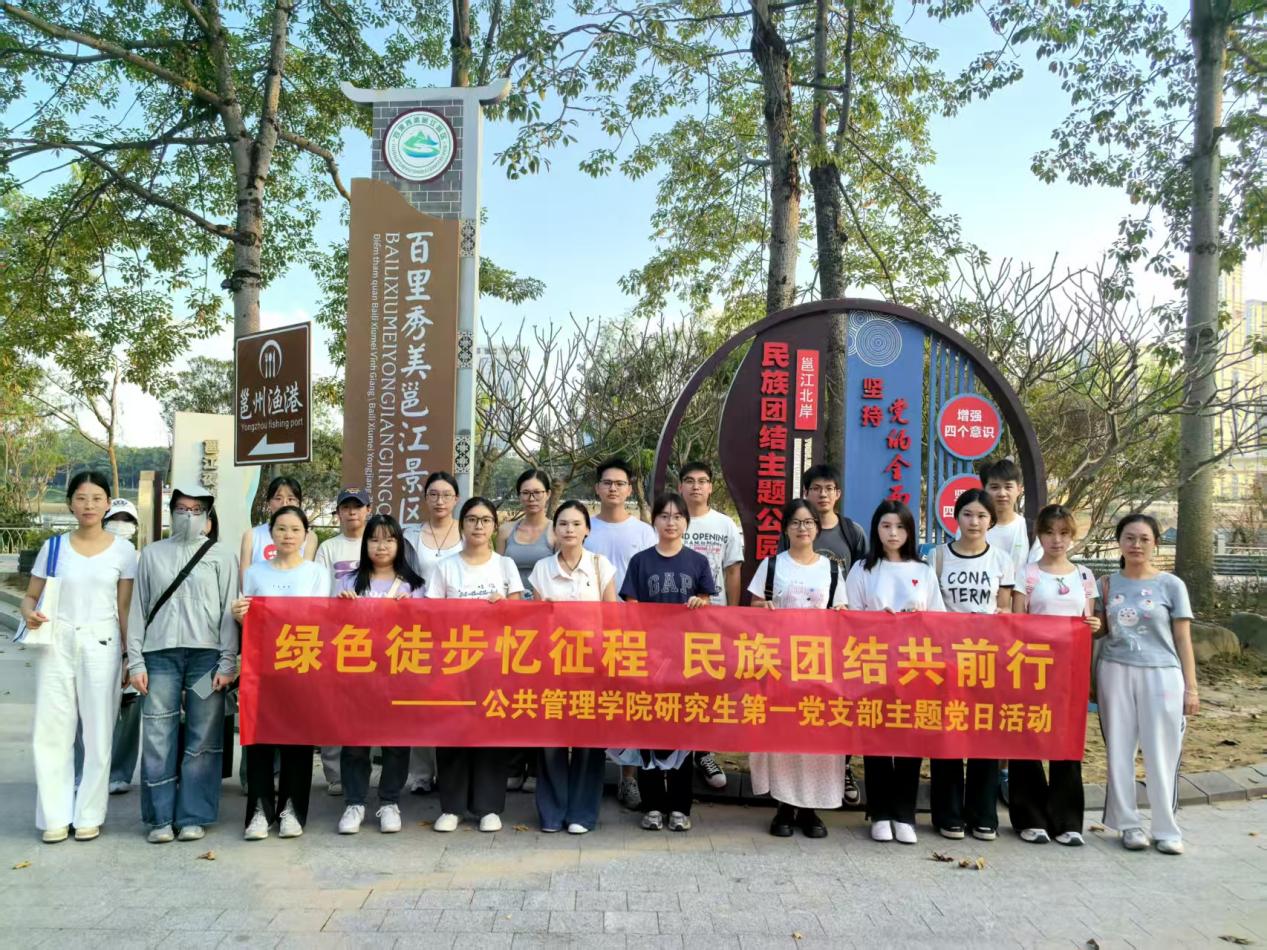 为深入学习贯彻习近平总书记关于民族团结的重要论述和视察广西时的重要讲话精神,将红色教育、民族团结教育与绿色发展理念有机融合,引导党员在徒步锻炼中感悟革命征程的艰辛,在互动交流中增强民族团结意识,2025年10月18日,AV直播 研究生第一党支部开展了“绿色徒步忆征程 民族团结共前行”主题党日活动,本次活动由支部副书记陈玉婷主持,支部全体党员、发展对象、入党积极分子参加。