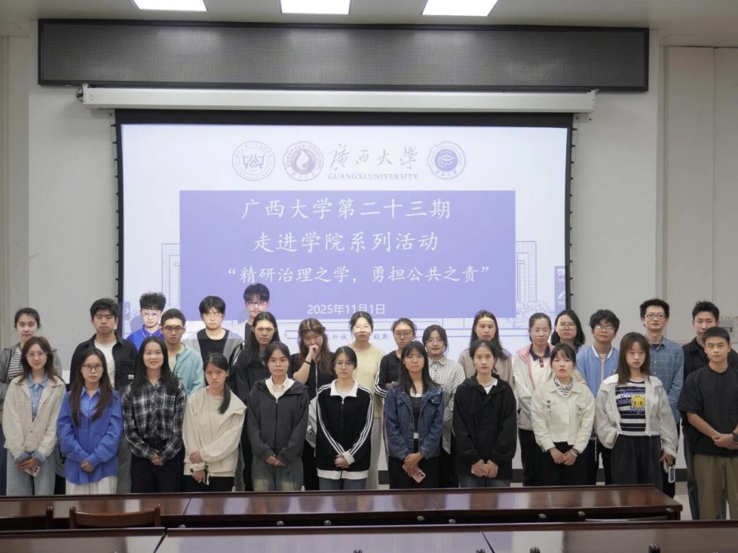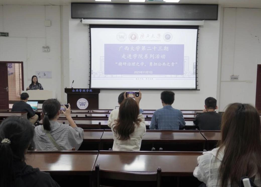 为增进广大同学对AV直播 的了解,促进各学院之间的互动交流,11月1日下午,广西大学第二十三期“走进学院”系列活动在AV直播 顺利开展。本次活动由广西大学研究生会主办,公共管理学院研究生会承办,以“精研治理之学,勇担公共之责”为主题,由AV直播 研究生会主席团成员钟巧悦主讲,吸引了来自各个学院的本科生和研究生参与其中。