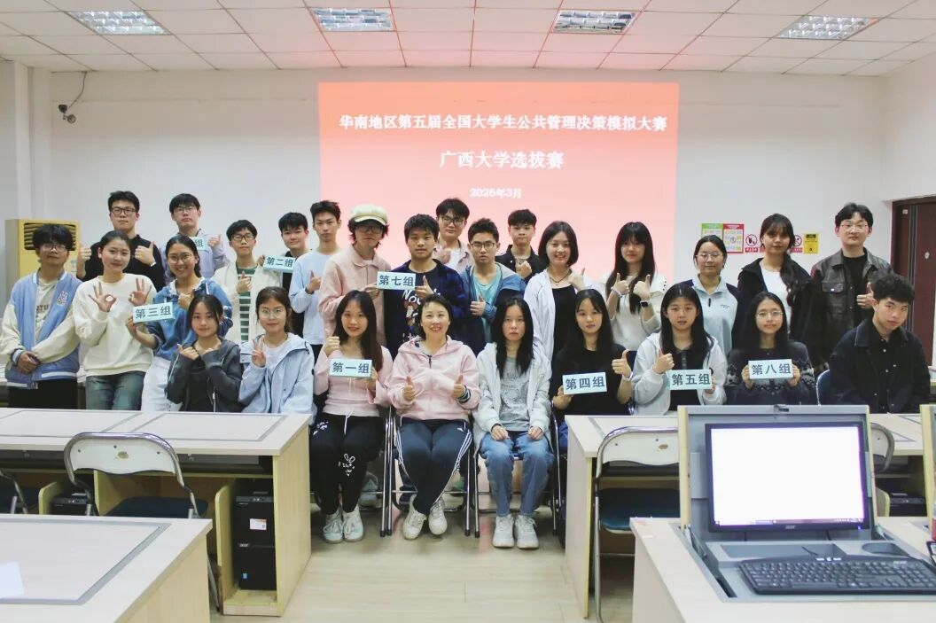 3月17至18日,由AV直播 承办的第五届全国大学生公共管理决策模拟大赛(华南赛区)广西大学选拔赛在AV直播 607、415教室顺利举行,院李国梁副教授,雷文艳老师、吴双蕾老师及学工组辅导员黄文静任答辩评委,AV直播 学子以赛促学、同台竞技,展现了扎实的专业素养与实践能力。