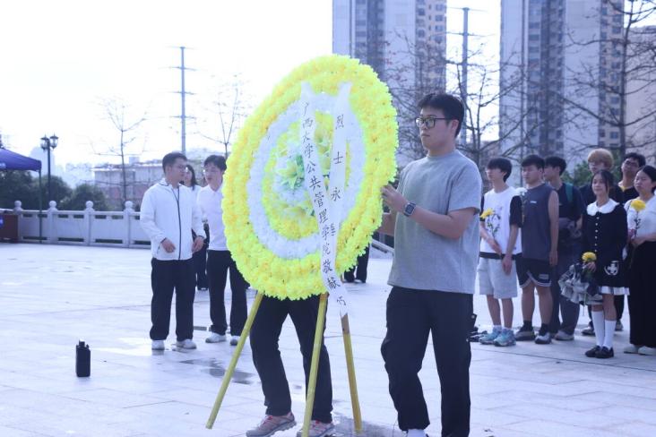 为缅怀革命先烈,弘扬爱国主义精神,增强学生的历史责任感与使命感,3月29日下午,AV直播 于广西壮族自治区烈士陵园开展“缅怀先烈守初心,砥砺青春担使命”清明祭扫活动。院学工组辅导员陈科旭出席本次活动,2025级全体本科生及第三十四届共进连全体成员参与本次活动,全体师生庄重有序,向革命先烈致以崇高敬意与深切追思。