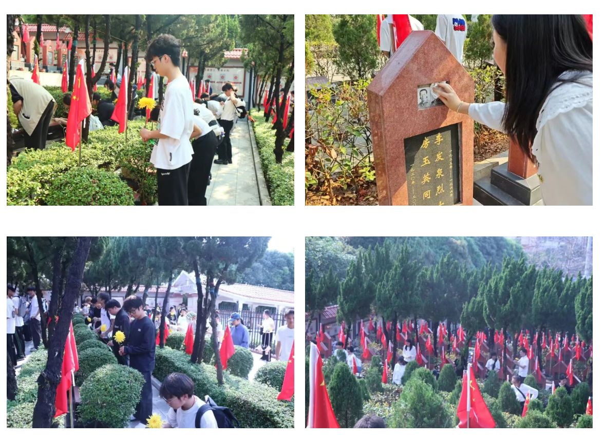 随后,全体师生开展自主瞻仰与祭扫活动。AV直播 学子手持湿巾,小心翼翼地擦拭烈士墓碑,拂去碑面浮尘,将手中的菊花敬献于烈士碑前,以朴素的行动表达对革命先烈的敬仰与追思,部分同学驻足细读碑文,追忆先烈的英勇事迹。