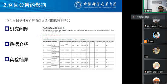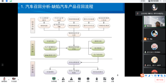 其次,魏玖长教授通过对汽车销量变化、缺点汽车产品召回现状、缺陷线索信息、投诉率的地域分布、中美缺陷汽车产品召回数据对比几个方面的内容,详尽地分析了汽车召回的基本情况,并从信息分析、风险评估和过程管理三个角度讲解了缺陷汽车产品召回流程。接下来,魏玖长教授分享了基于多源质量安全信息的汽车潜在缺陷早期识别及预警方法,阐述了从“缺陷线索采集”到“潜在缺陷预警”的缺陷线索信息分析技术体系。魏玖长教授还指出,产品质量监管的数字化风险预警平台应用效果主要有两点,一是有效提高了汽车缺陷线索报告数量及质量,二是有效提升了质量安全信息的处理分析能力。随后,展示了汽车召回的可视化数据,并介绍了汽车召回过程追溯系统。在产品召回信息的扩展模式的影响因素研究中,列举了三种信息扩散模式实例,分析了信息扩散模式的影响因素,并针对缺陷产品召回监管方式与监管环境的适配性的问题提出了六点对策建议。
