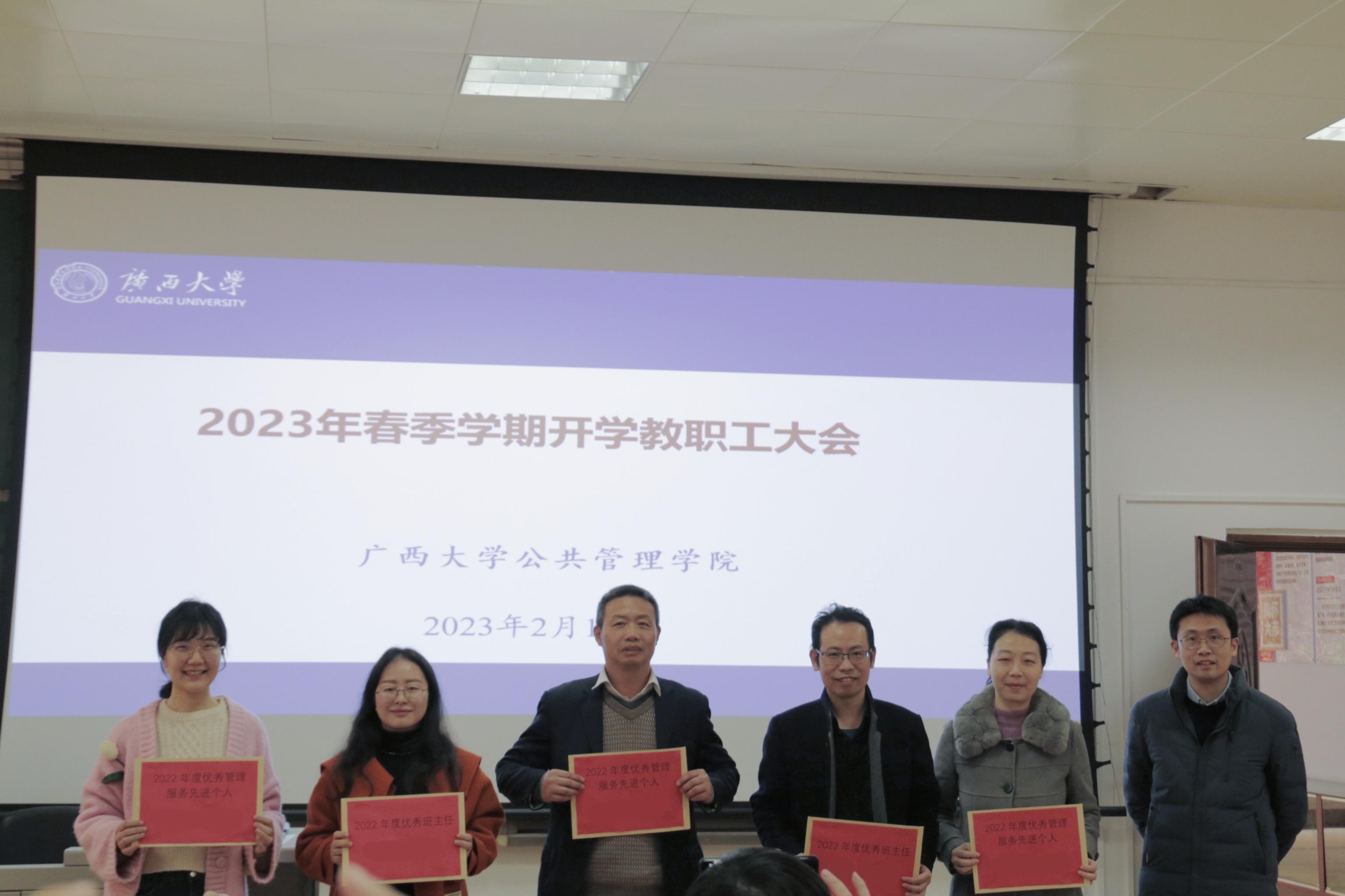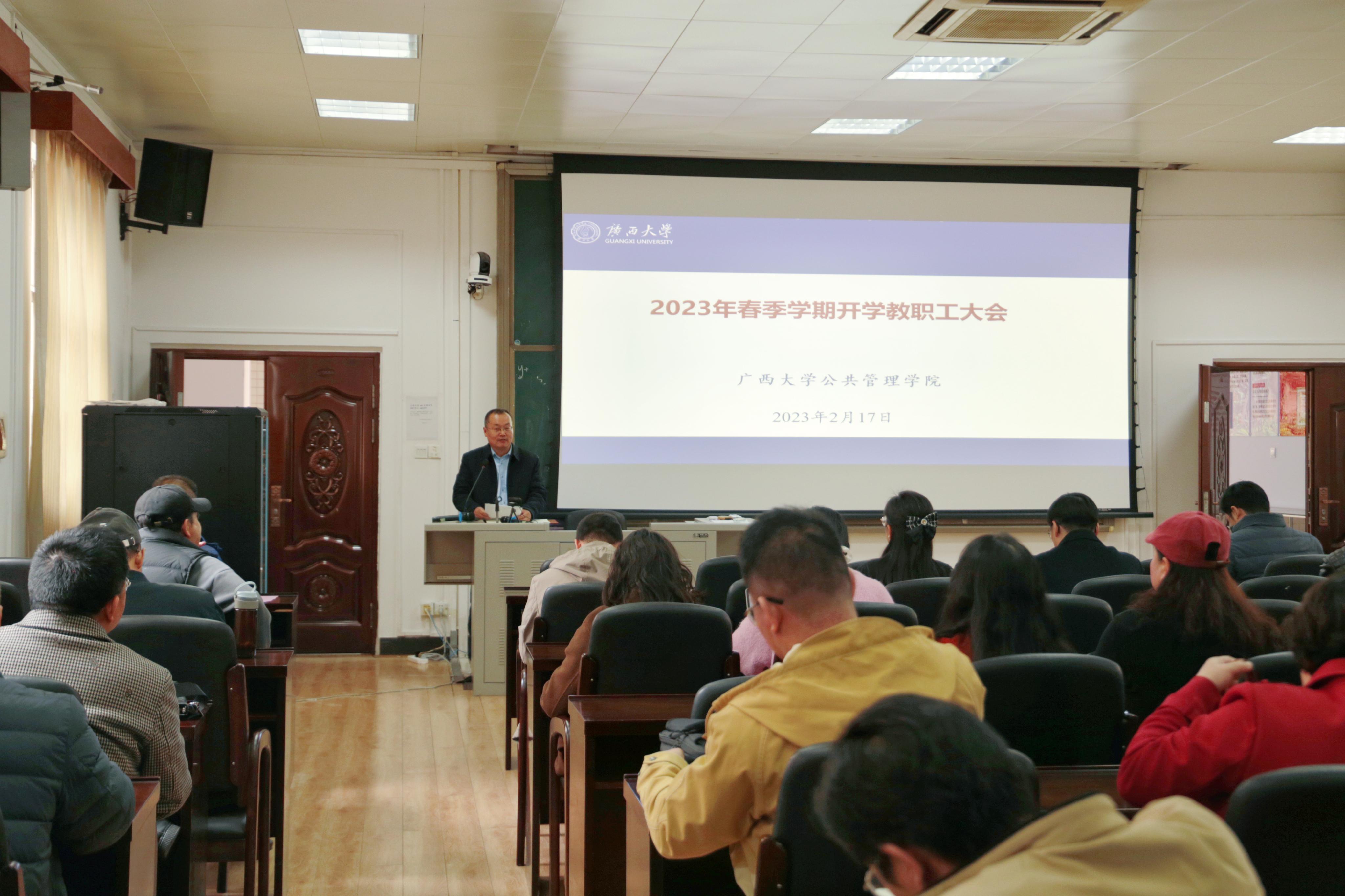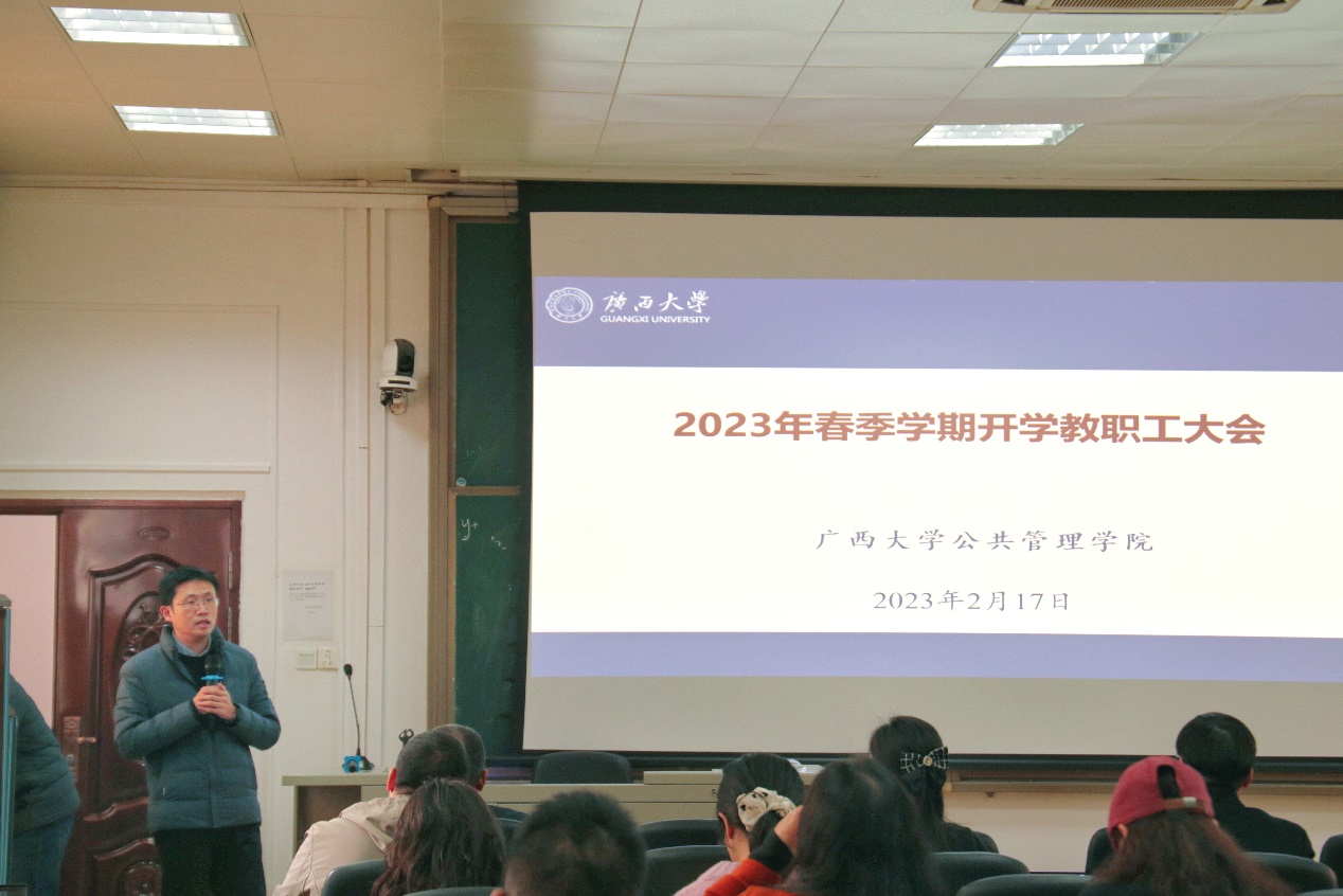 会上,首先由史云贵院长作开学工作讲话。他首先肯定了2022年全体教职工戮力同心,共同努力取得的成绩。同时指出2023年学院发展的工作思路,从学院班子的分工、院系调整、科研成果评价、学院资源的整合与盘活、学院空间布局规划等十个方面作新学期重点工作布置。史院长表示,2023年是学院全面贯彻党的二十大精神、学院全面提速发展关键之年,全体教职工要凝心聚力、振奋精神、锐意进取,全力推动学院高质量发展。会上学院领导班子结合分管工作,结合学校相关的会议精神和学院的发展定位及创新路径,对新学期工作提出了部署安排。