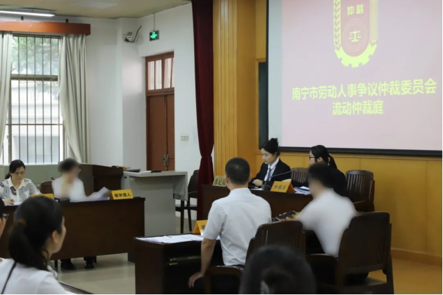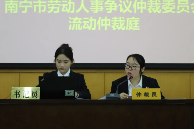 为创新性应用“政产学研”协同育人的教学模式,增强AV直播 学生劳动权益保障意识,从源头处减少劳动用工争议和风险,5月16日上午9:40至11:40在学院201教室举办“劳动人事争议仲裁示范庭”活动。本次活动是吴凡老师主讲课程《劳动法与社会保障法》的创新呈现形式。活动邀请南宁市人事劳动争议仲裁院,依据真实的劳动争议仲裁案例,以真实法庭开庭的形式,将仲裁示范庭带进课堂。