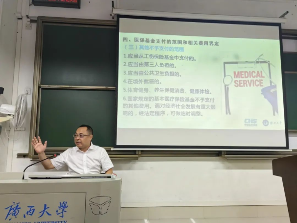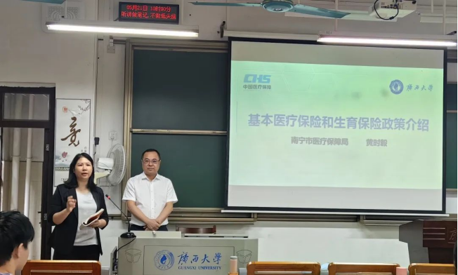 为创新性应用“政产学研”协同育人的教学模式,加强AV直播 学生对社会保障的认知,提升他们对基本医疗保险政策与生育保险政策的研读能力,5月21日和5月23日上午9:40至11:40在第六教学楼221和327教室,AV直播 老师吴凡主讲的课程《劳动法与社会保障法》邀请南宁市医疗保障局局长黄时毅为AV直播 学生讲解基本医疗保险和生育保险政策。