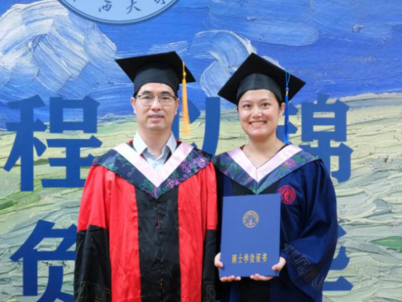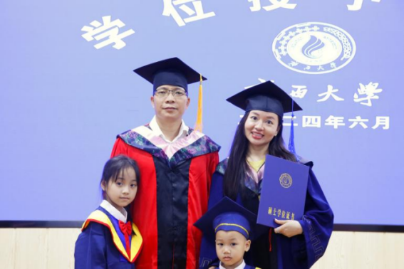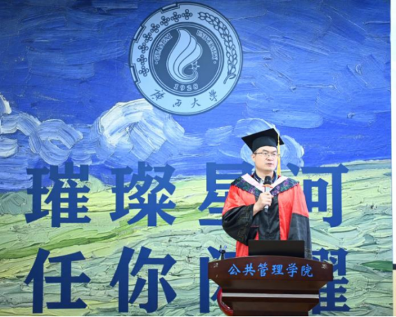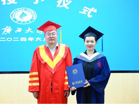 毕业生代表周冲表示,在紧张的社会生活中找到学习节奏是每位非全日制学生的必修课,并以广西大学校训“勤恳朴诚、厚学致新”和AV直播 院训“博学笃行”为指导,鼓励毕业生们在未来的道路上永怀希望、不惧困阻,继续为实现“复兴中华、发达广西”的目标而努力。