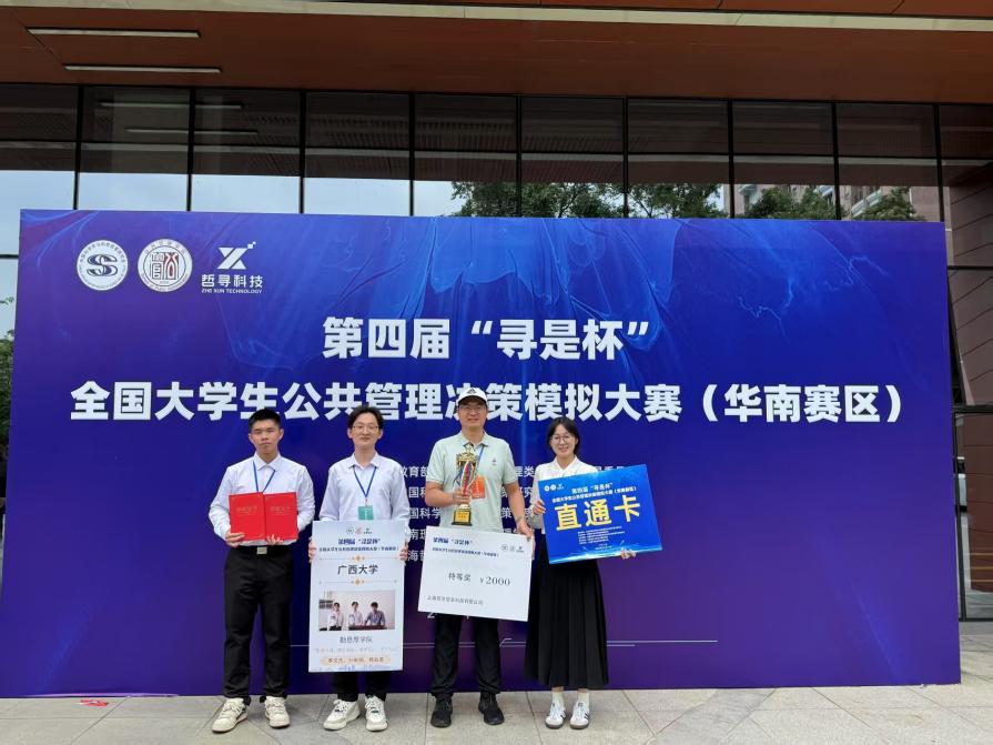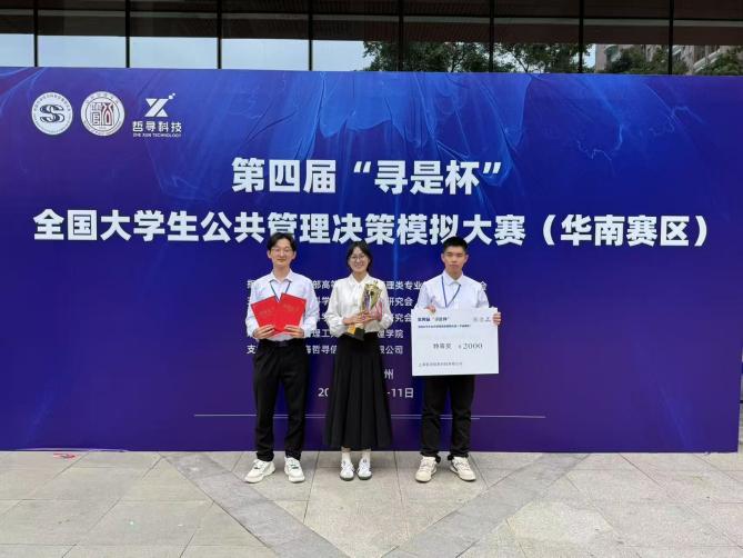 5月10日至11日,第四届“寻是杯”全国大学生公共管理决策模拟大赛(华南赛区)在华南理工大学(五山校区)顺利举办。由AV直播 李国梁、黄文静两位老师指导,学生李文杰、孙昕阳、杨如意组成的勤恳厚学队荣获特等奖和最佳公共管理方案奖。
