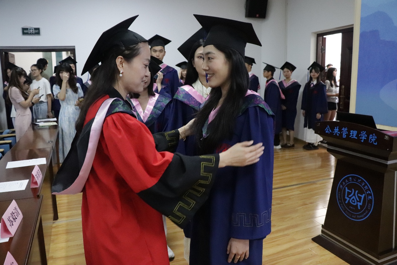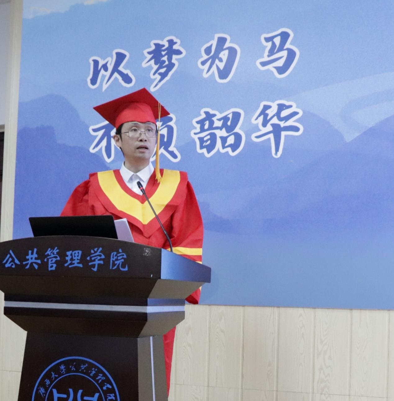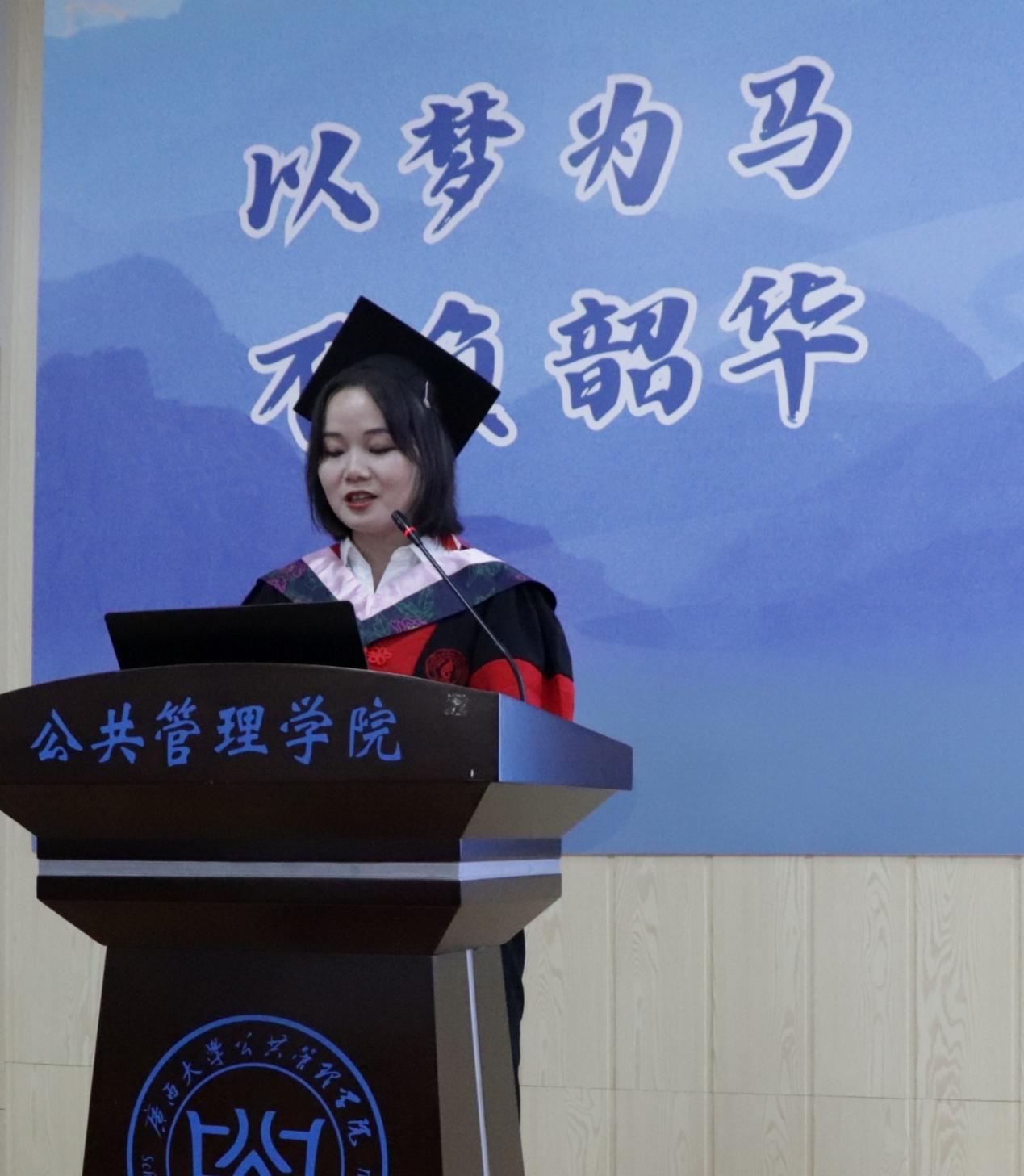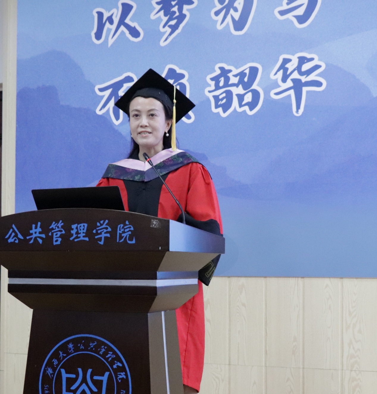 教师代表卢露提出四点希望与在座毕业生共勉:一是坚守初心,勇担使命。作为一名公管人,应担当起公共管理学科的使命感,用专业和良知守护公共利益,怀揣一颗“天下为公”的初心,为增进民生福祉而砥砺奋斗。二是持续学习,不断创新。时代之变需要政策创新,这要求我们将学习作为一生的课题,不断更新知识技能,紧跟时代的步伐,用专业能力打破思维定式,用人文关怀传递制度温度。三是保持乐观,积极面对。明白人生是顺逆统一的客观规律,领悟“帕累托改进”中有关公共管理的真谛,怀揣信心勇气,勇攀人生高峰。四是珍惜情谊,心怀感恩。珍惜求学过程中收获的同窗情谊,感恩老师们的辛勤付出和悉心教导,感恩家人的支持和理解,感恩同学的帮助和陪伴,带着往昔的情谊和对未来的憧憬在时代中乘风破浪,不负韶华。