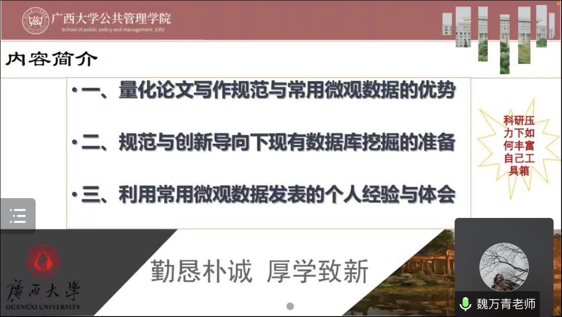 2022年10月12日下午,广西大学第98期“导师有约”暨AV直播 第26期学术沙龙以腾讯会议的形式顺利开展。本期学术沙龙的主题为“定量论文写作:现有数据库挖掘与利用”,邀请AV直播 魏万青老师作为主讲人进行分享,吸引校内外众多博士生、硕士生前来参与。本次沙龙由AV直播 苏毅清老师主持。