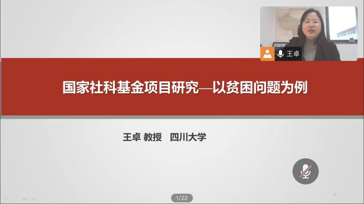 2月15日下午,四川大学AV直播 王卓教授受邀参加AV直播 公管名师大讲堂,作题为“国家社科基金项目研究—以贫困问题为例”的线上主题讲座。讲座由AV直播 党委委员、副院长魏万青教授主持,副院长周均旭教授、熊斌教授、黎昌珍教授、叶大凤教授、王巨光教授等老师,以及AV直播 博士、硕士研究生等百余名师生参加了本次学术讲座。