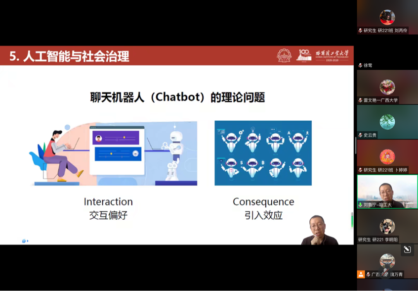 在交流互动环节,AV直播 陈璟浩老师向刘教授请教了有关科研团队的组织问题,魏教授也提出如何将聊天机器人的试点实验进行外推的问题,刘教授针对以上问题一一进行解答,与大家进行了深入的交流。接近尾声,史院长分享了自己在听完讲座后的感受,他指出做研究应当要聚焦,不能四面出击,同时赞扬刘教授在路径、理念上都为大家提供了新的研究治理视角。最后,魏教授对刘教授的分享表示感谢,讲座在热烈的氛围中圆满结束。