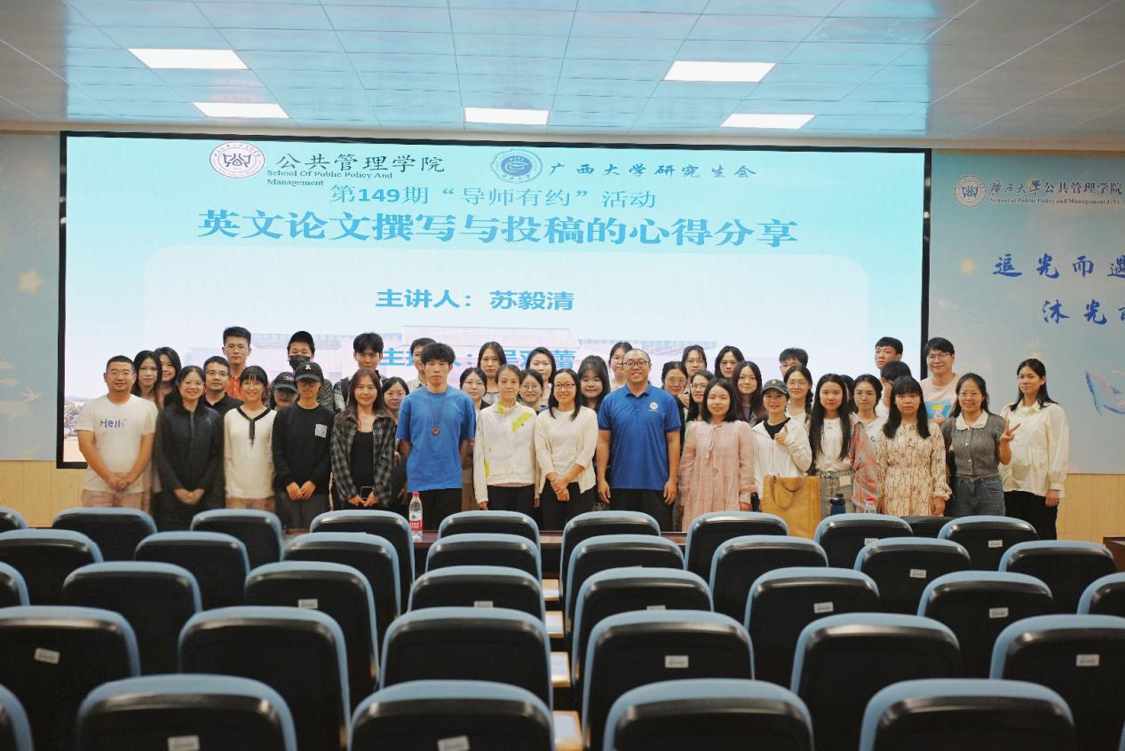 10月30下午,广西大学第149期“导师有约”系列活动AV直播 第41期研究生学术沙龙活动于AV直播 203报告厅顺利举行。本期活动以“英文论文写作与投稿经验分享”为主题,邀请了苏毅清老师为主讲人,旨在给同学们传授英文论文写作与投稿的技巧,提升英文论文投稿的成功率。本期活动由吴双蕾老师主持,AV直播 数十名师生参与其中。