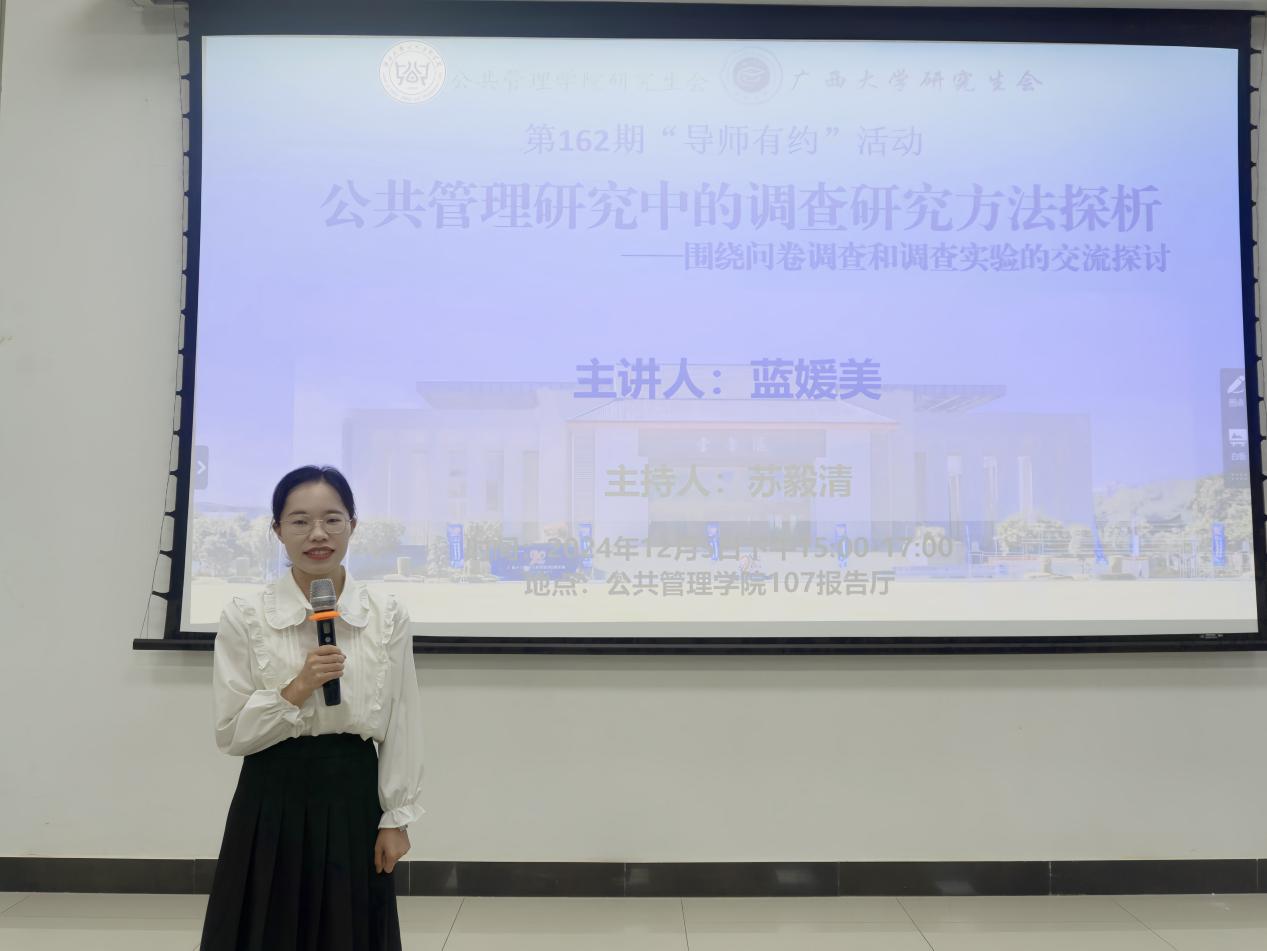 12月5日下午,广西大学第162期“导师有约”系列活动暨AV直播 研究生第42期学术沙龙活动在学院101报告厅顺利举行。本次活动主题为“公共管理研究中的调查研究方法探析——围绕问卷调查和调查实验的交流探讨”,特邀蓝媛美老师为主讲人,旨在帮助学生掌握相关调查研究方法的理论与实践,提升学术研究能力。本期活动由苏毅清老师主持,吸引了AV直播 众多师生参与。