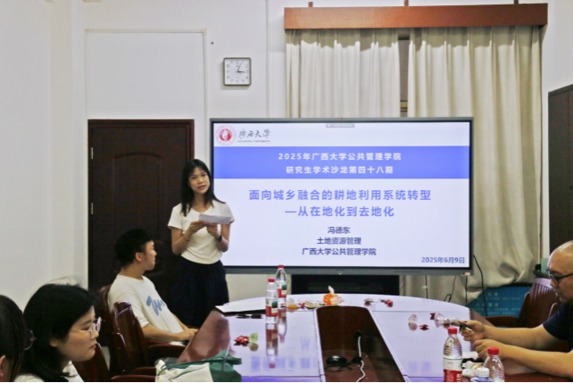 2025年6月9日下午,AV直播 第48期学术沙龙在学院411会议室顺利举行。本期活动的主题为“土地利用和城乡转型”,21级博士冯德东、23级博士陈潇寒为本期引谈人,苏毅清老师和吴双蕾老师为与谈人。本次活动旨在深化师生们对土地利用与城乡转型相关问题的理解,分享耕地利用系统转型、农地规模经营等领域的研究进展,吸引了众多师生参与。