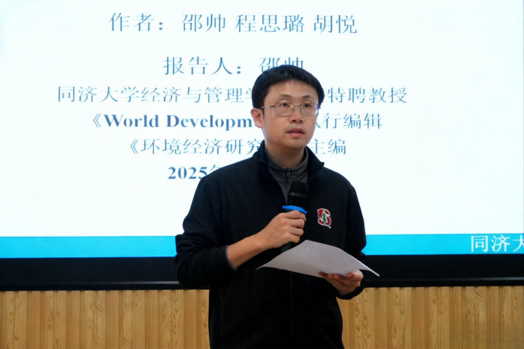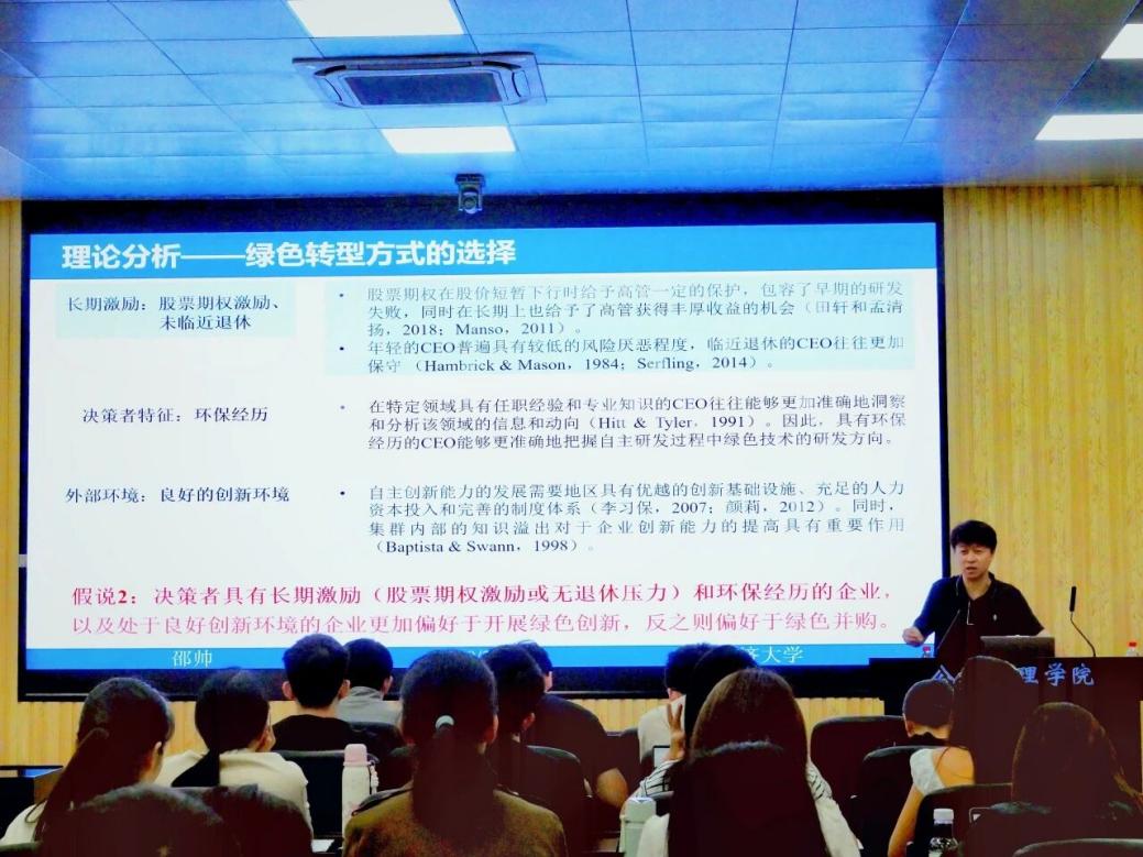 11月1日上午,同济大学经济与管理学院特聘教授邵帅受邀于AV直播 107报告厅开展题为《顺势而为还是随机应变:理解碳减排政策下的企业绿色转型决策》的专题讲座。本次讲座由AV直播 院长聂鑫教授主持,副院长曾凡军教授出席本次讲座,吸引众多博士、硕士研究生到场聆听,讲座现场座无虚席,与会者热情高涨,学术交流氛围十分活跃。