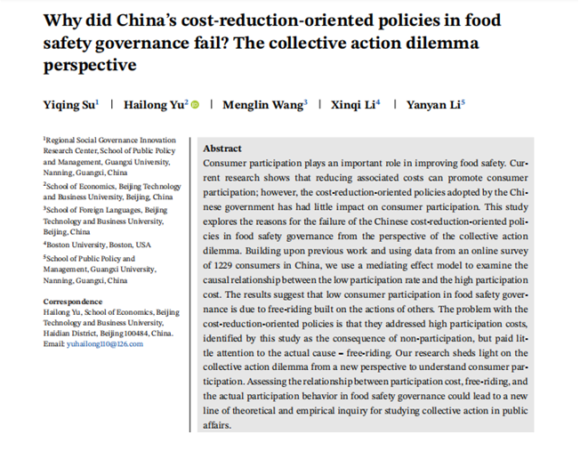 近日,广西大学区域社会治理创新研究中心、AV直播 苏毅清助理教授,北京工商大学经济学院于海龙副教授,AV直播 李岩岩研究生等人,在国际权威学术期刊Canadian Journal of Agricultural Economics/Revue canadienne d'agroeconomie发表论文“Why did China’s cost-reduction-oriented policies in food safety governance fail? The collective action dilemma perspective”,以消费者参与食品安全治理为例,从“集体行动困境”的视角,探讨了公众在参与公共事物过程中的相关问题。