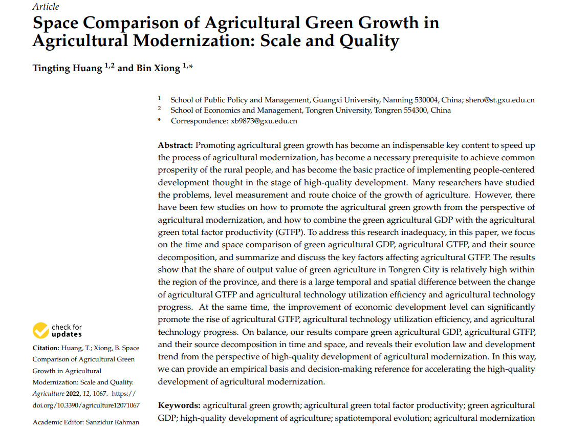 黄厅厅、熊斌在Agriculture-Basel发文探讨农业现代化中农业绿色增长的空间比较:规模与质量