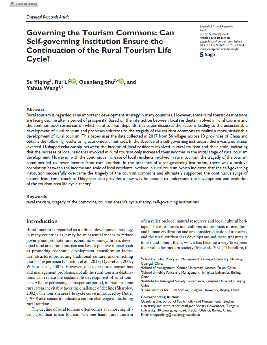 苏毅清、舒全峰、王亚华等在Journal of Travel Research发文阐释乡村旅游可持续发展的制度逻辑