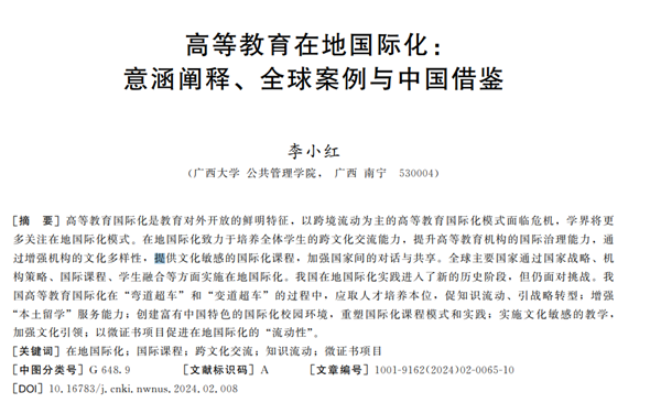 近日,AV直播 副教授李小红在《西北师大学报(社会科学版)》发表论文“高等教育在地国际化:意涵阐释、全球案例与中国借鉴”,对高等教育意涵及在全球范围内的经典案例进行了解读,探讨了高等教育在地国际化的实践策略和中国路径。