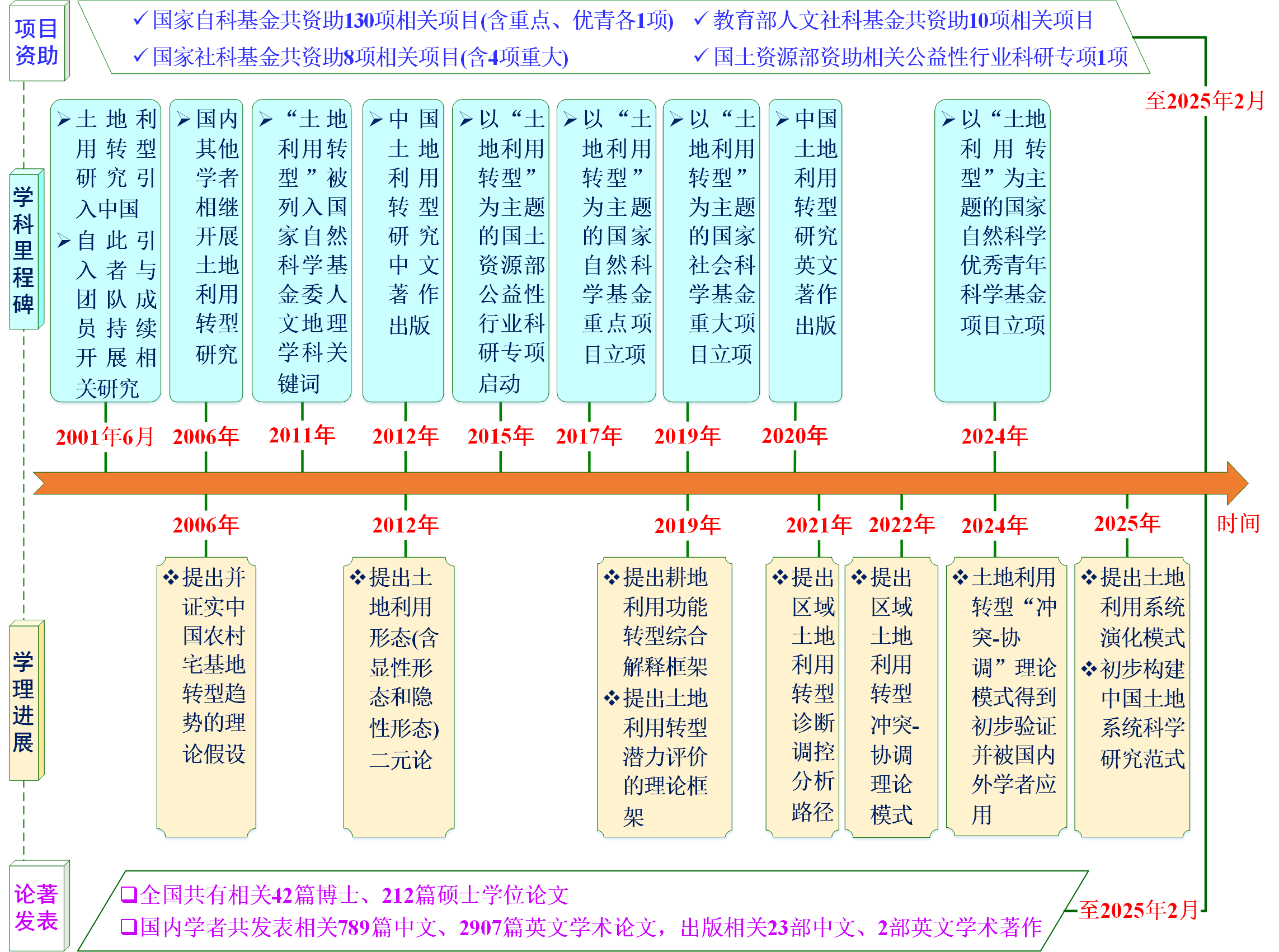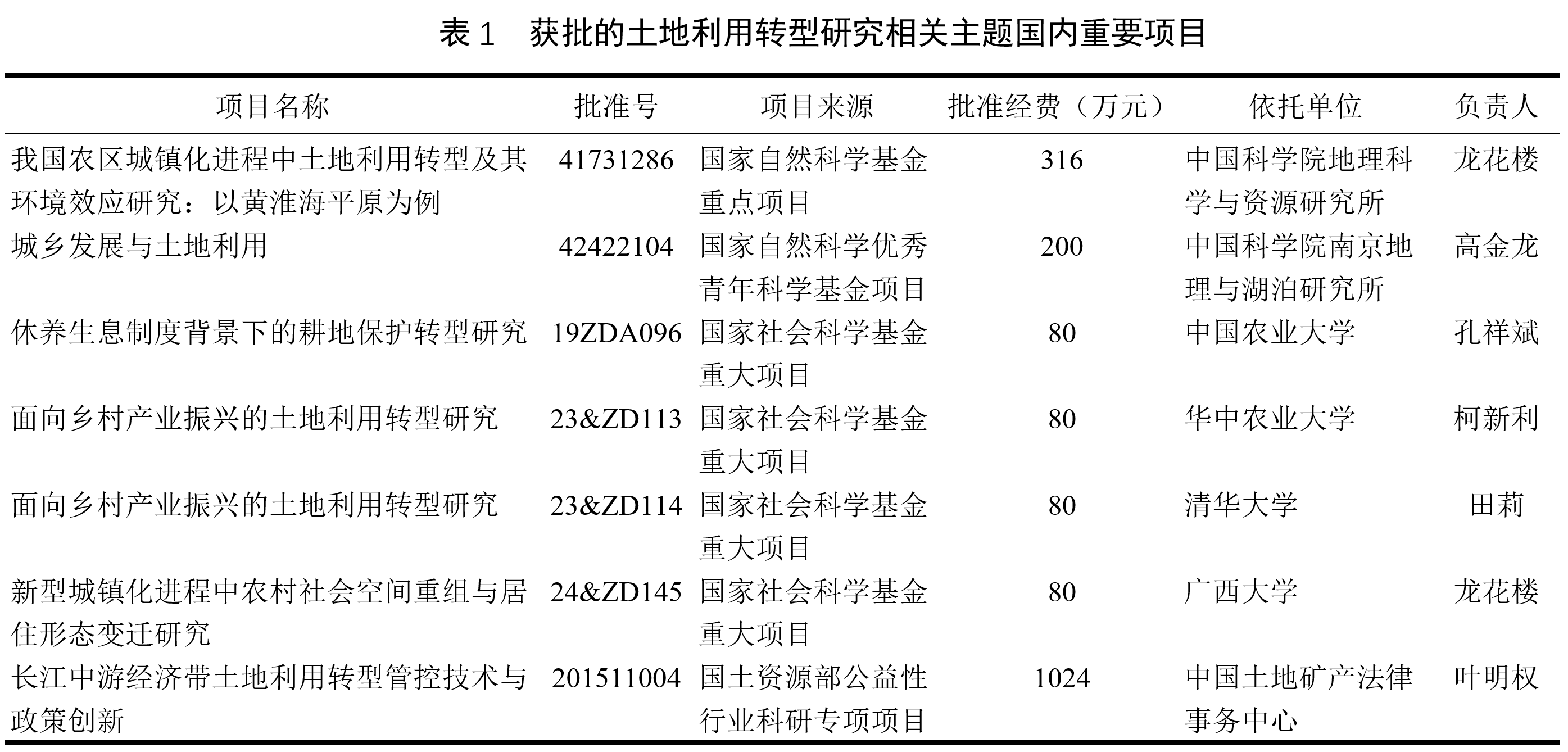 土地利用转型研究是龙花楼在其博士后合作导师李秀彬研究员指导下于2001年引入中国,随后与团队成员持续开展相关研究,2012年将土地利用形态的概念内涵拓展为显性形态和隐性形态两种类型,2022年系统总结梳理20多年来的研究成果并提出区域土地利用转型“冲突—协调”理论模式,至2025年初已发表相关学术论文110余篇。2006年国内其他学者相继开展相关研究。2011年“土地利用转型”被列入国家自然科学基金委员会人文地理学科关键词,随后相关主题的研究论著发表和资助项目数量快速增长。据统计,2002—2024年国家自然科学基金共资助相关主题研究项目130项,包括重点项目1项,优秀青年基金项目1项,面上项目55项,青年项目60项,地区项目13项。国家社会科学基金资助相关主题重大项目4项,一般项目3项,西部项目1项。此外,教育部人文社科基金资助相关主题规划基金项目5项,青年项目5项。这些受资助的项目中,不乏一些重要项目(表1)。