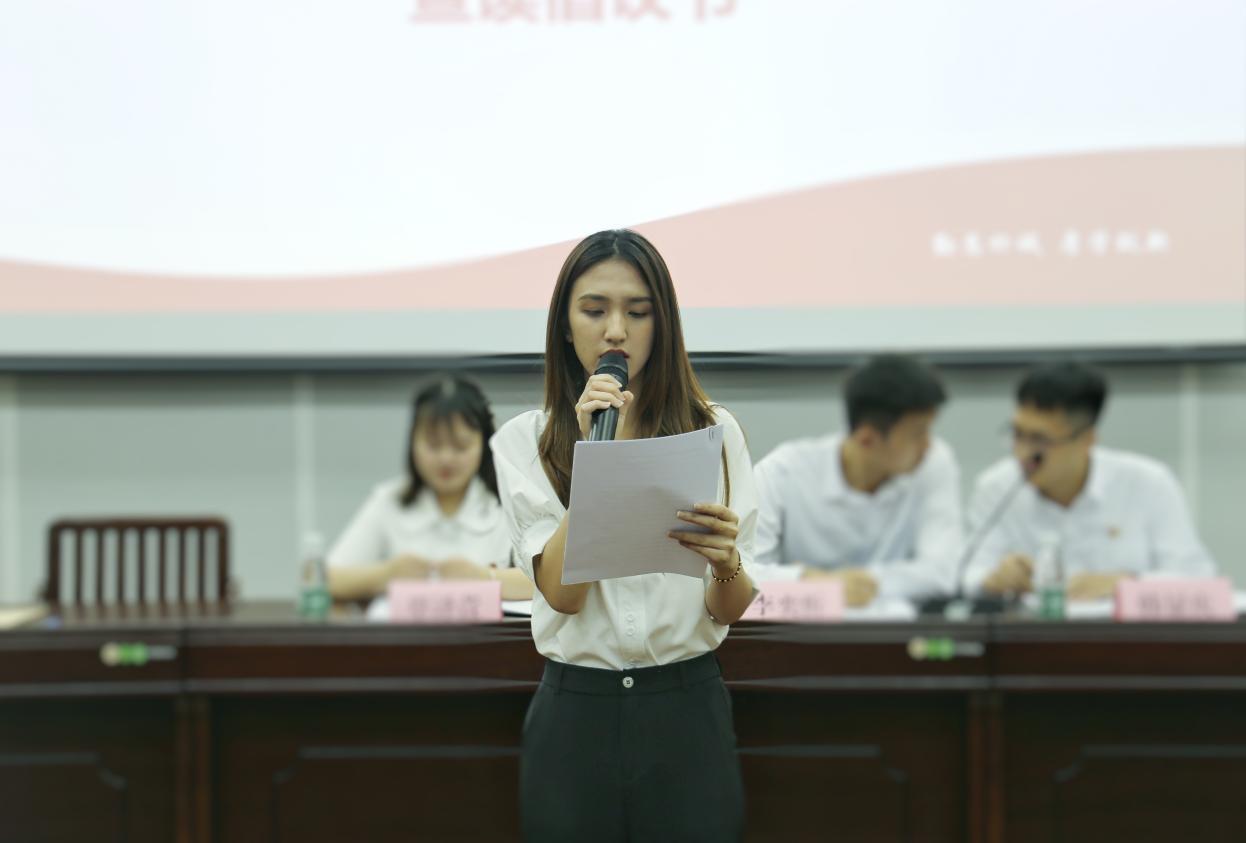 新任主席团成员代表粟钰清宣读倡议书,向AV直播 研究生发出倡议:一是要志存高远,厚植家国情怀;二是要明德至善,锤炼坚毅品格;三是要勤学求知,增强创新意识;四是要奋发有为,砥砺使命担当。