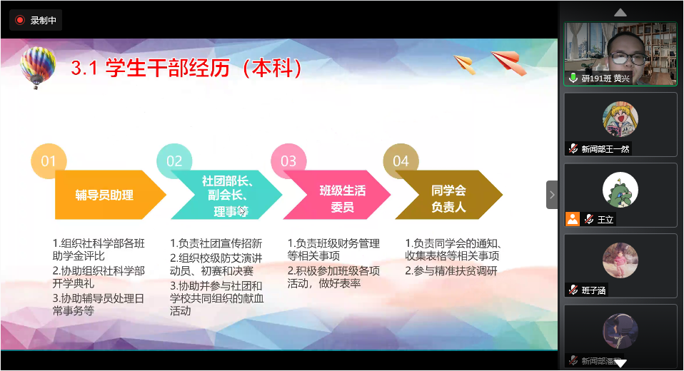 2020年8月28日下午三点,AV直播 研究生会第十九届换届选举在线上召开,学院党委副书记甘武琳、学工组刘佩瑶老师出席。