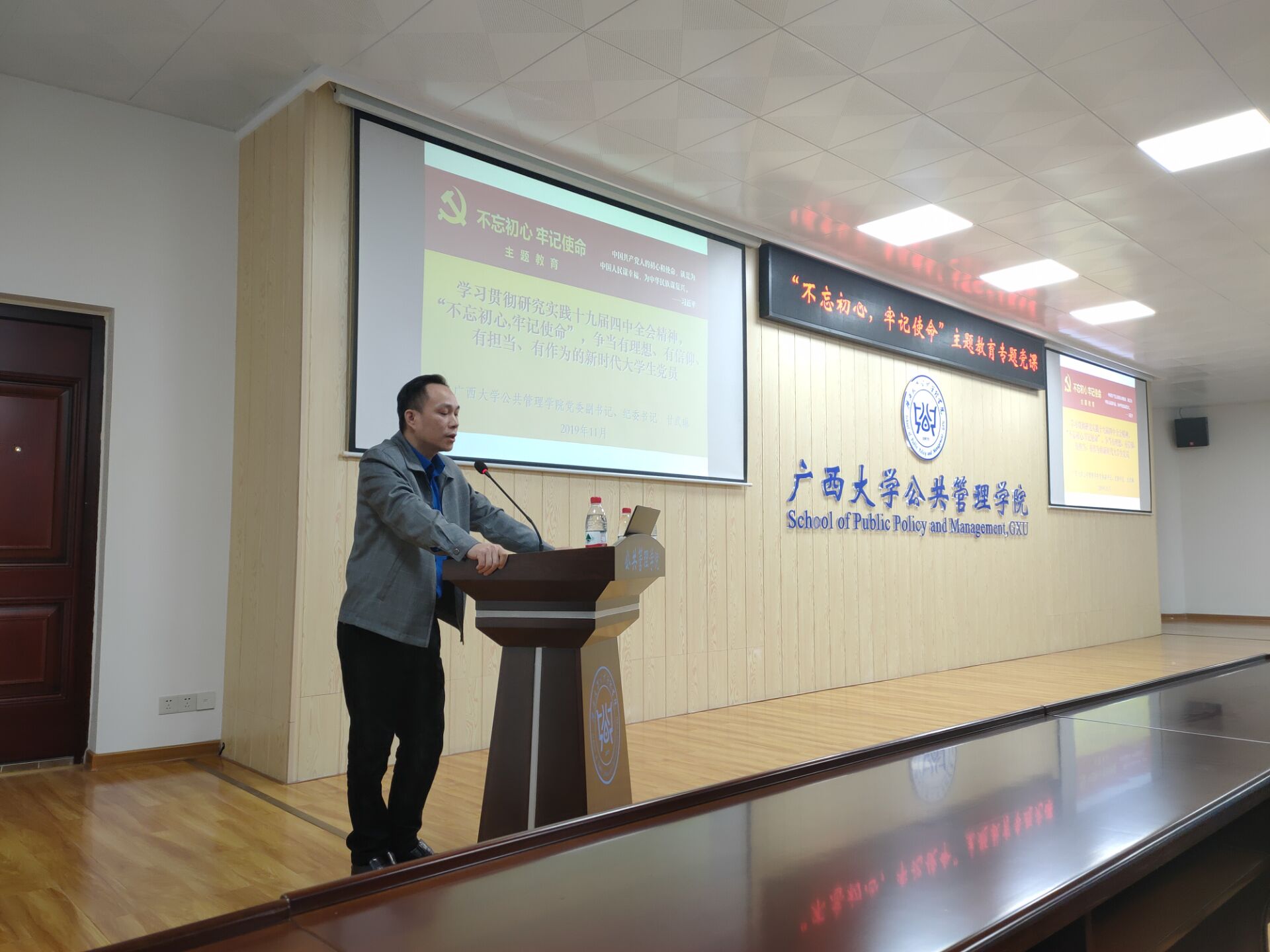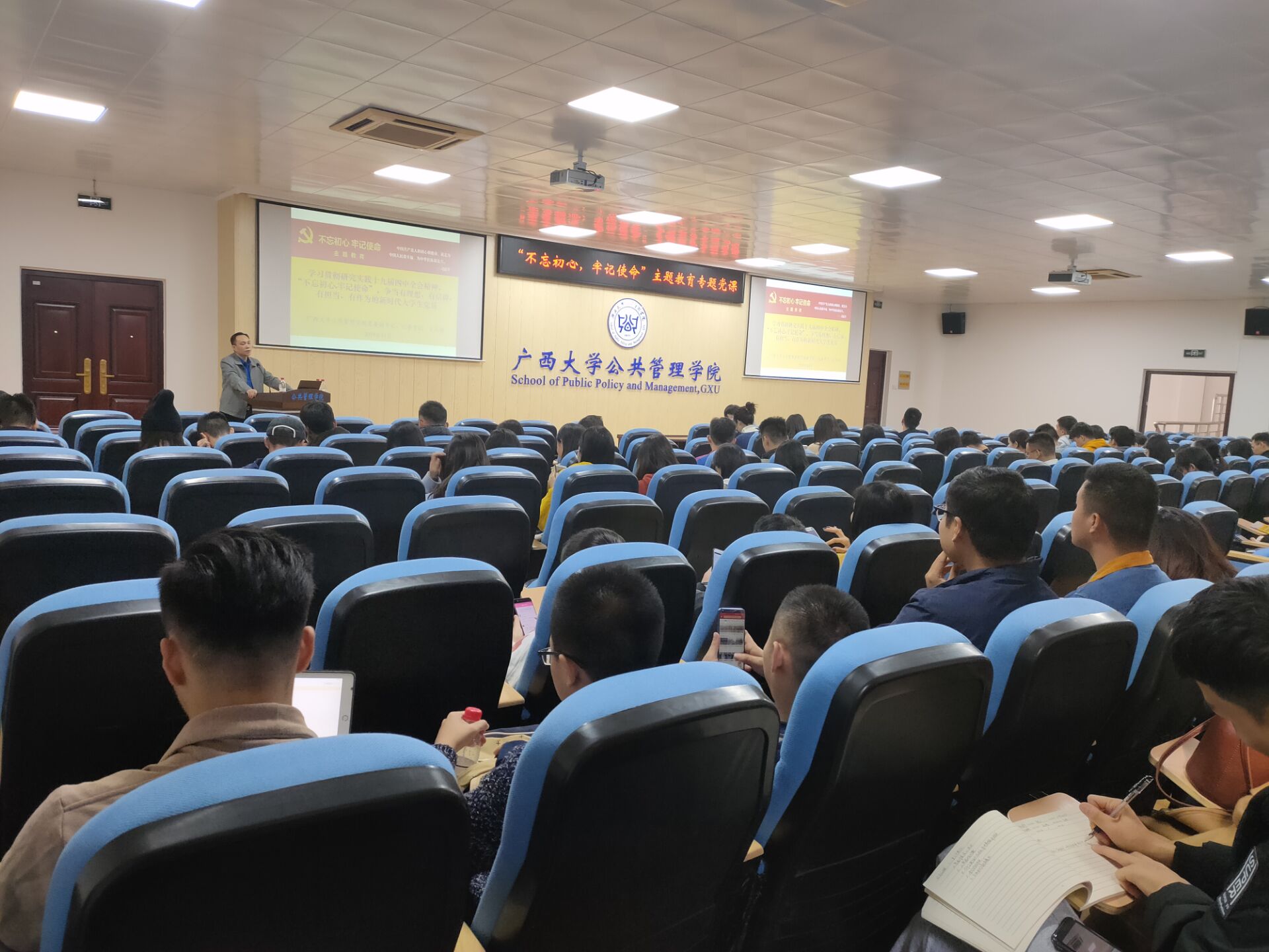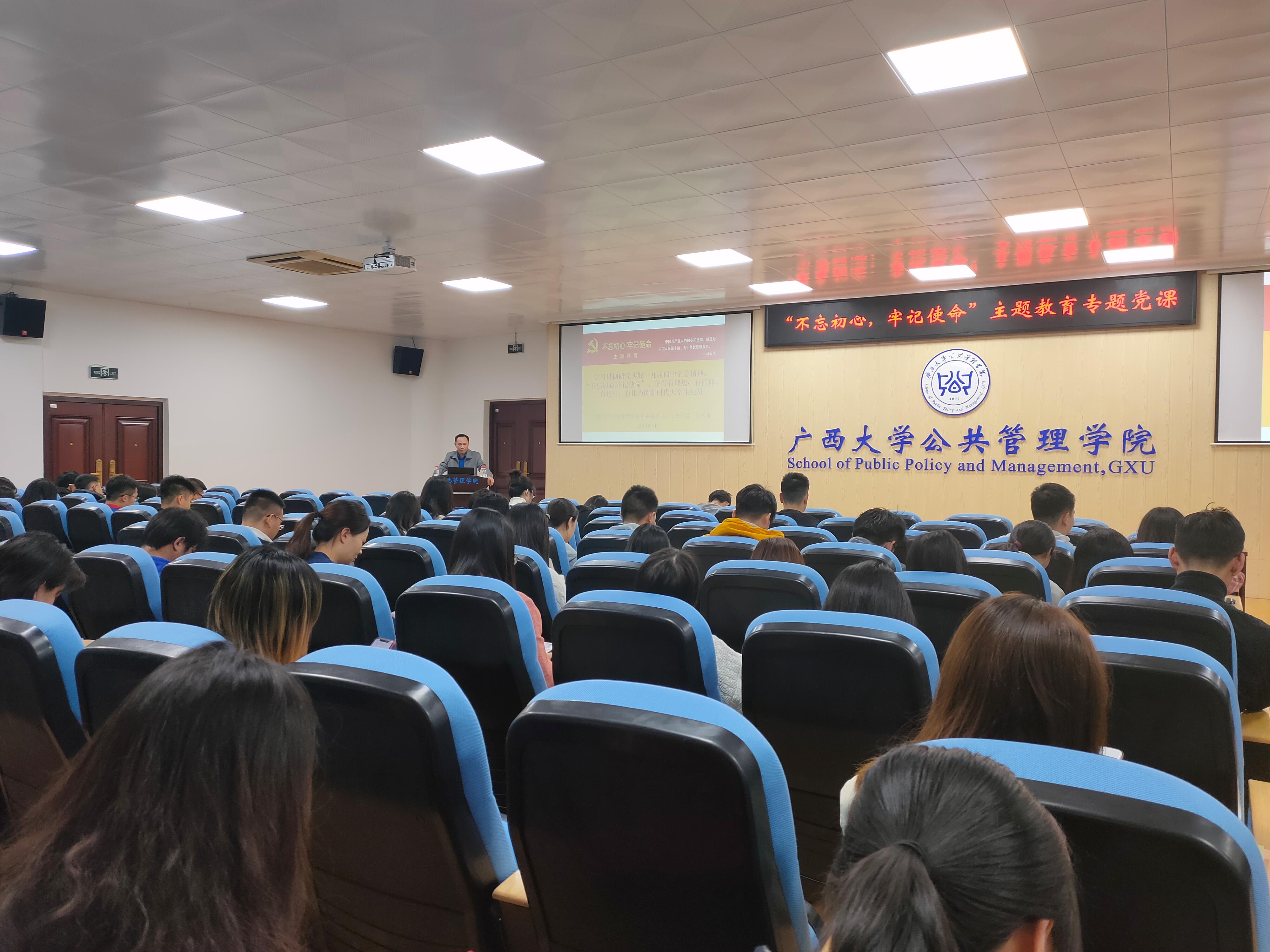 11月29日,AV直播 开展“不忘初心、牢记使命”主题教育专题党课,AV直播 党委副书记、纪委书记甘武琳以“学习贯彻研究实践党的十九届四中全会精神,“不忘初心、牢记使命”,争当有理想、有信仰、有担当、有作为的新时代大学生党员”为题讲授专题党课。全院预备党员、本科生支部党员和研究生支部党员出席党课。
