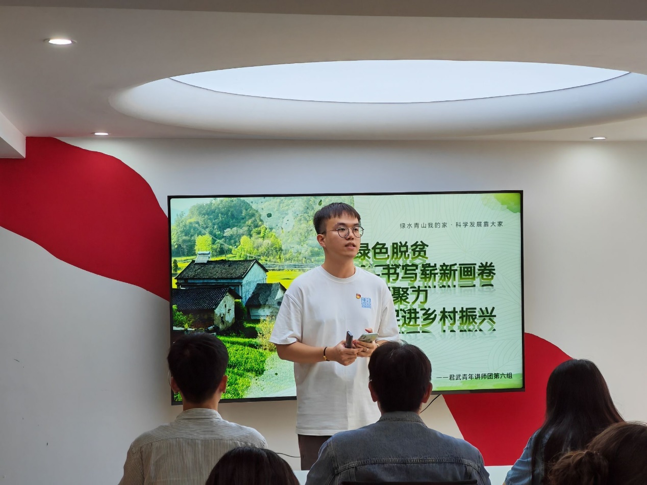 最后,王泽锋做总结发言。他强调各位党员要从主题宣讲中感悟提炼,以绿色发展、生态振兴为重要抓手,不断巩固拓展脱贫攻坚成果,进一步推动乡村振兴事业向深向实发展。作为公管学子,应当充分发挥专业优势,结合个人职业规划,通过学习与实践将绿色发展与生态振兴作为重要研究方向,为乡村振兴贡献智慧与力量、为公共管理学科发展增添光彩,进而实现个人价值与社会价值的统一。