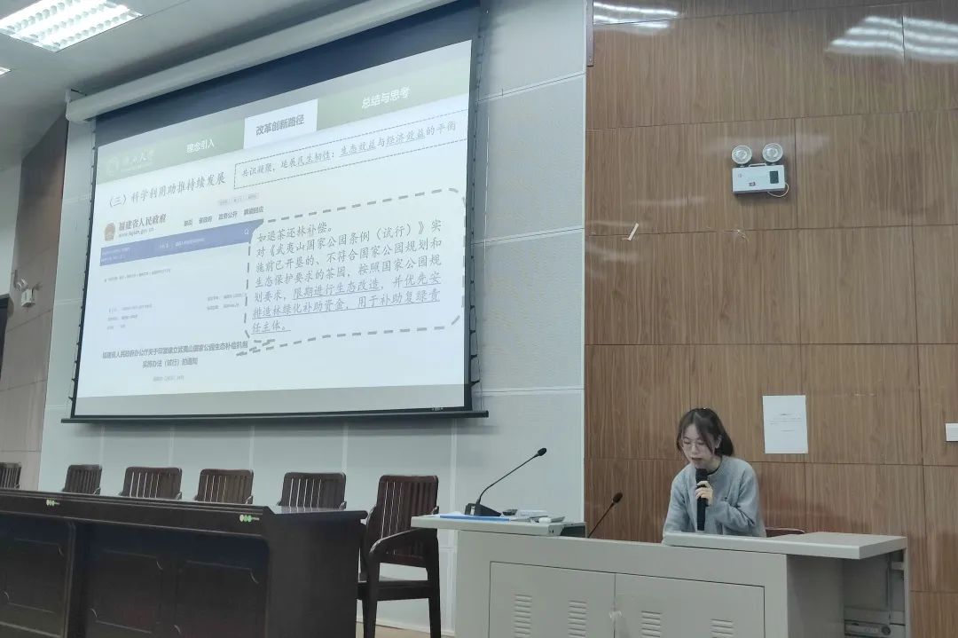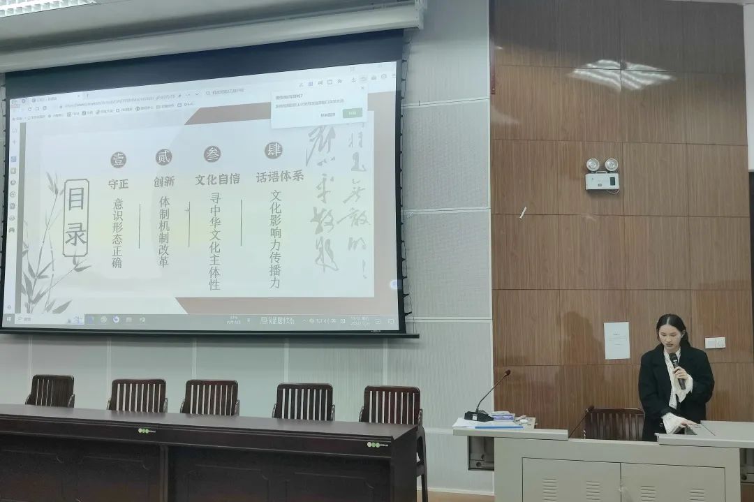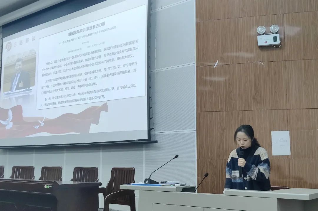随后,支部党员围绕习近平总书记在党的二十届三中全会上的重要讲话精神与全面深化改革的新思想、新观点、新论断进行主题分享。陈爰熹分享了“守正创新、文化自信——深化文化体制机制改革”的内容,她强调文化体制机制改革的重要性,以及如何在守正的基础上进行创新,增强文化自信。李嘉怡分析的主题是“凝聚改革共识、激发奋进力量”,让同学们深刻认识到凝聚共识对于推动改革的重要性,以及如何将这种力量转化为实际行动。石伊荞以福建省武夷山国家公园的生态建设创新发展路径为例,分享了“凝聚改革共识,激发奋进力量”的具体实践,使大家更加直观地理解了改革在实际中的作用和成果。