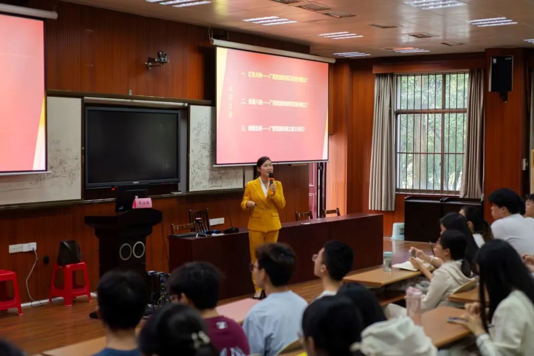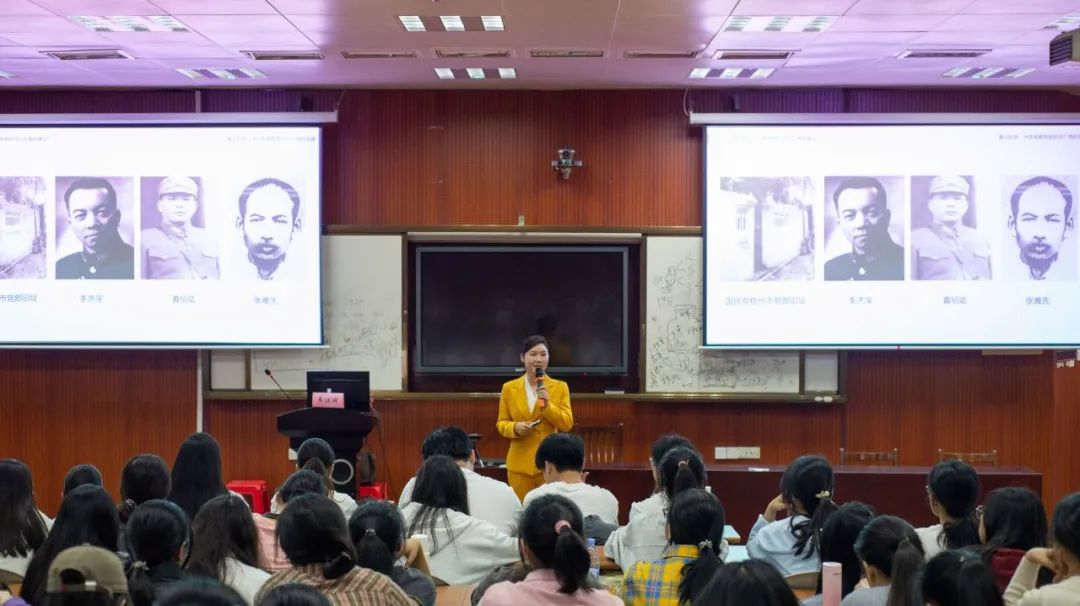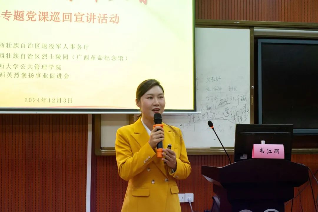 为进一步促进青年学生知党爱党,用党的奋斗历程和伟大成就鼓舞斗志、明确方向,用党的光荣传统和优良作风坚定信念、凝聚力量,用党的实践创造和历史经验启迪智慧、砥砺品格,12月3日,AV直播 于学院201教室开展“党史铸魂,精神立骨”专题党课宣传活动,本次巡回宣讲的主题是“星火初照——中国共产党早期组织在广西的建立”,邀请到广西革命纪念馆的韦江丽老师担任主讲。AV直播 党建会部分党员和共进连全体连员参与本次活动。