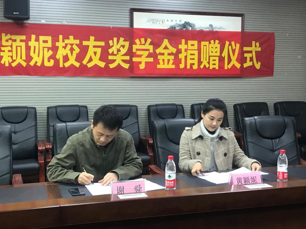 在捐赠仪式上,黄颖妮校友与谢舜书记签署奖学金捐赠协议,向学校教育发展基金会捐赠奖学金人民币10万元,用于在AV直播 设立“黄颖妮校友奖学金”,奖励保研和考研到本院继续攻读硕士研究生的优秀学生。