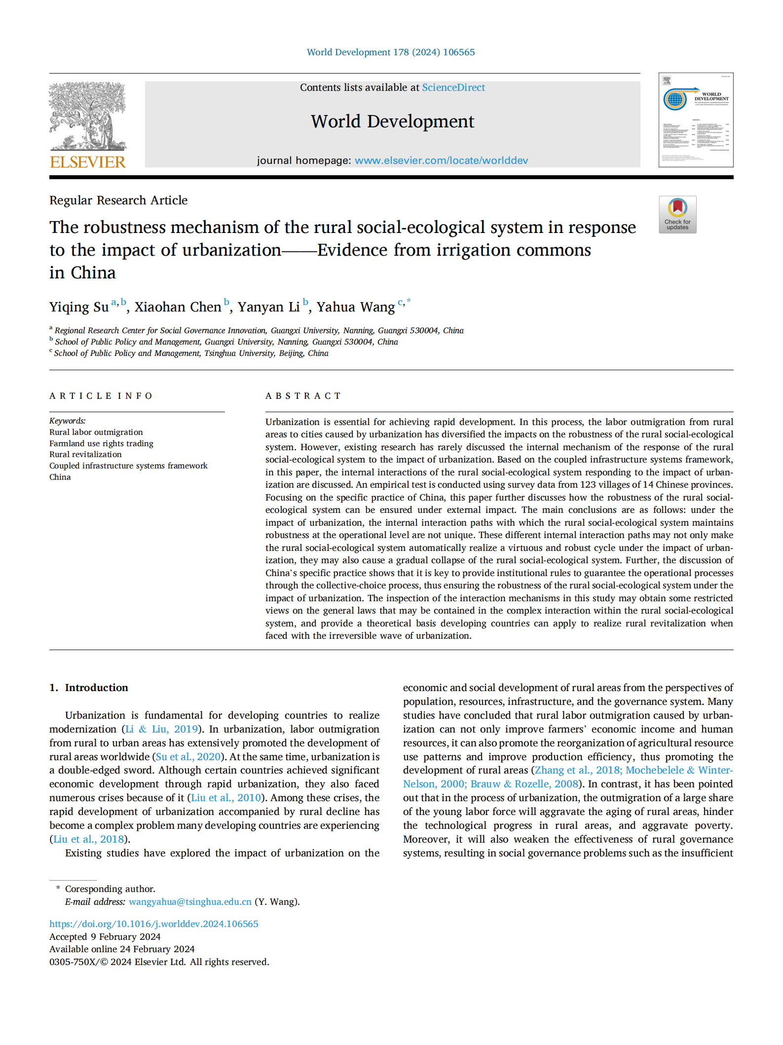 Yiqing, S., Chen, X., Li, Y., & Wang, Y.* (2024). The robustness mechanism of the rural social-ecological system in response to the impact of urbanization——Evidence from irrigation commons in China. World Development , 178: 106565. //doi.org/10.1016/j.worlddev.2024.106565